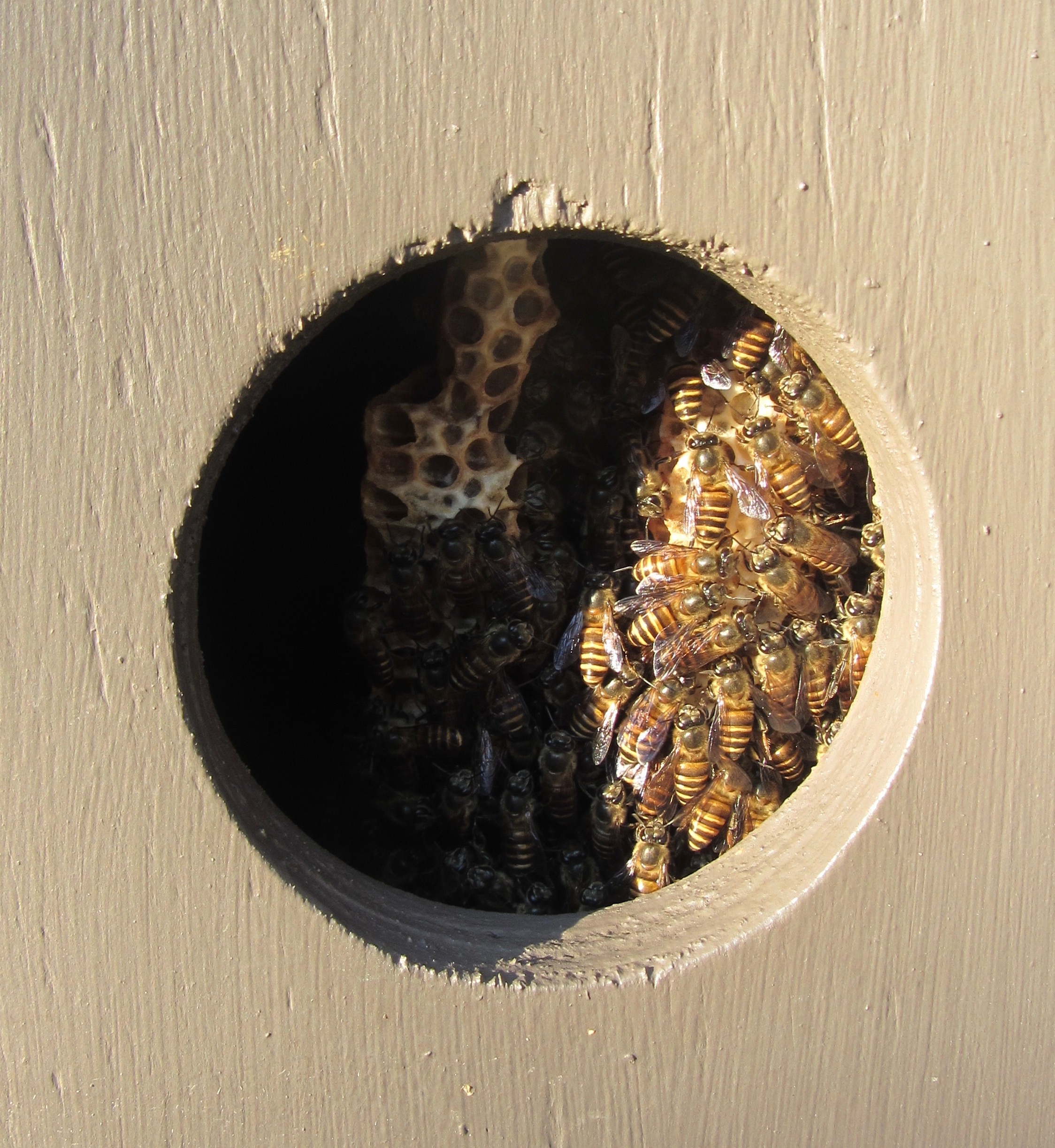 Image: Apis cerana nesting inside a birdbox in suburban Cairns, Far North Queensland Australia (photo: R. Gloag)