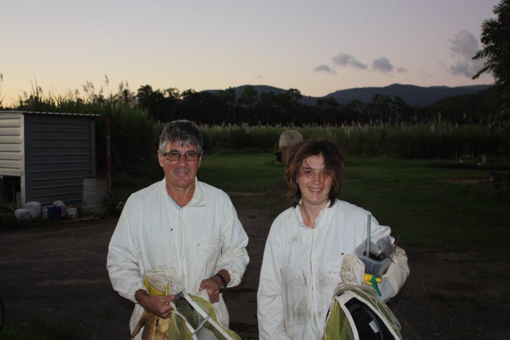 Image: Ben Oldroyd and Ros Gloag on the hunt for invasive honey bees in the cane fields of tropical Queensland (photo: W. Scougall).