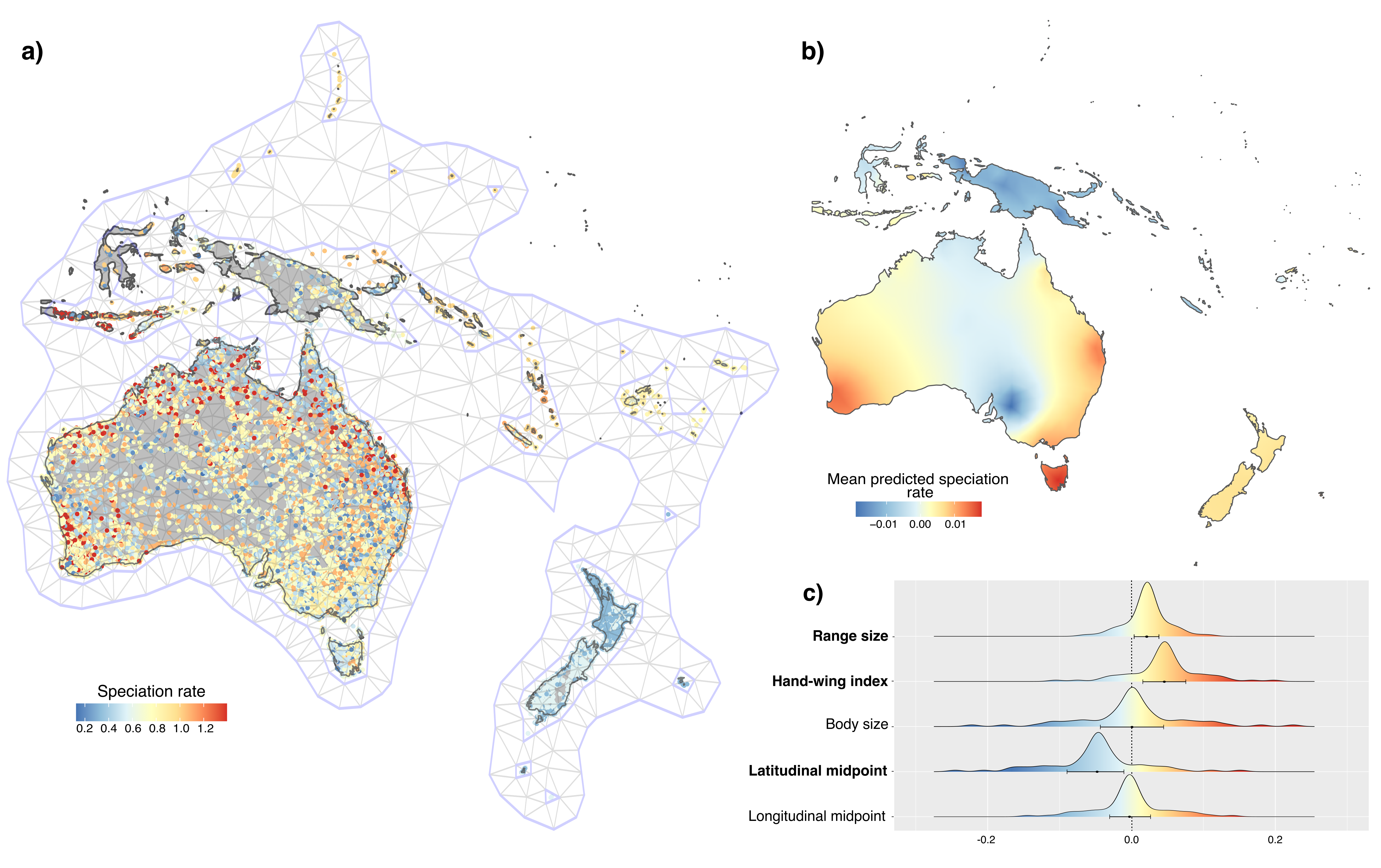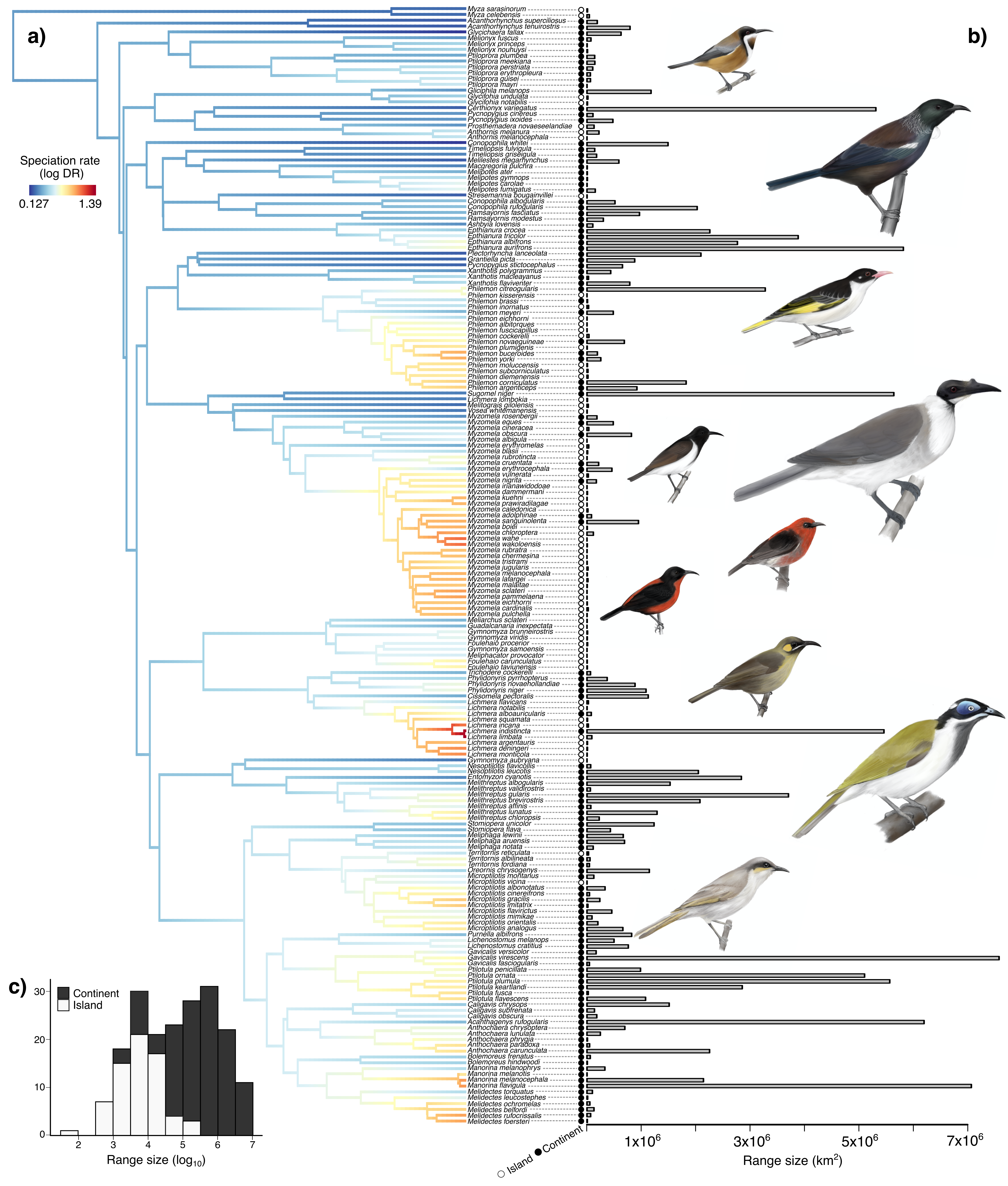 To consider the multiple interactions of traits and geographic setting on range size and speciation we used Bayesian phylogenetic structural equation models. At this stage it became clear that greater dispersal ability is important for speciation in honeyeaters, which was not surprising given that previous research has indicated dispersal events throughout Indonesia and the South Pacific played a prominent role in honeyeater evolution. We also found that islands had a significant effect on range size. Based on this we investigated the range size-speciation relationship in island and continental species separately, finding that in continental species larger ranges are associated with higher rates of speciation.