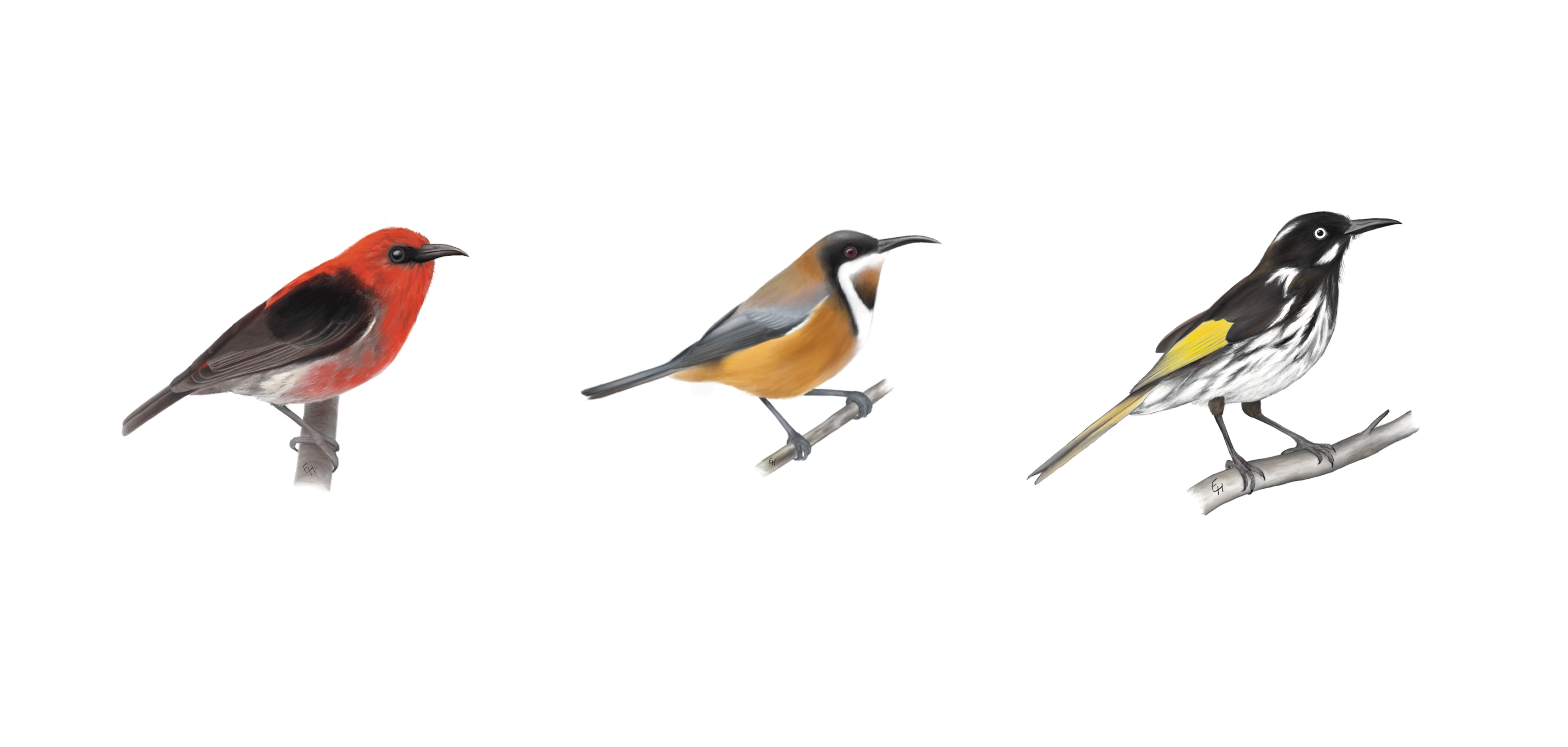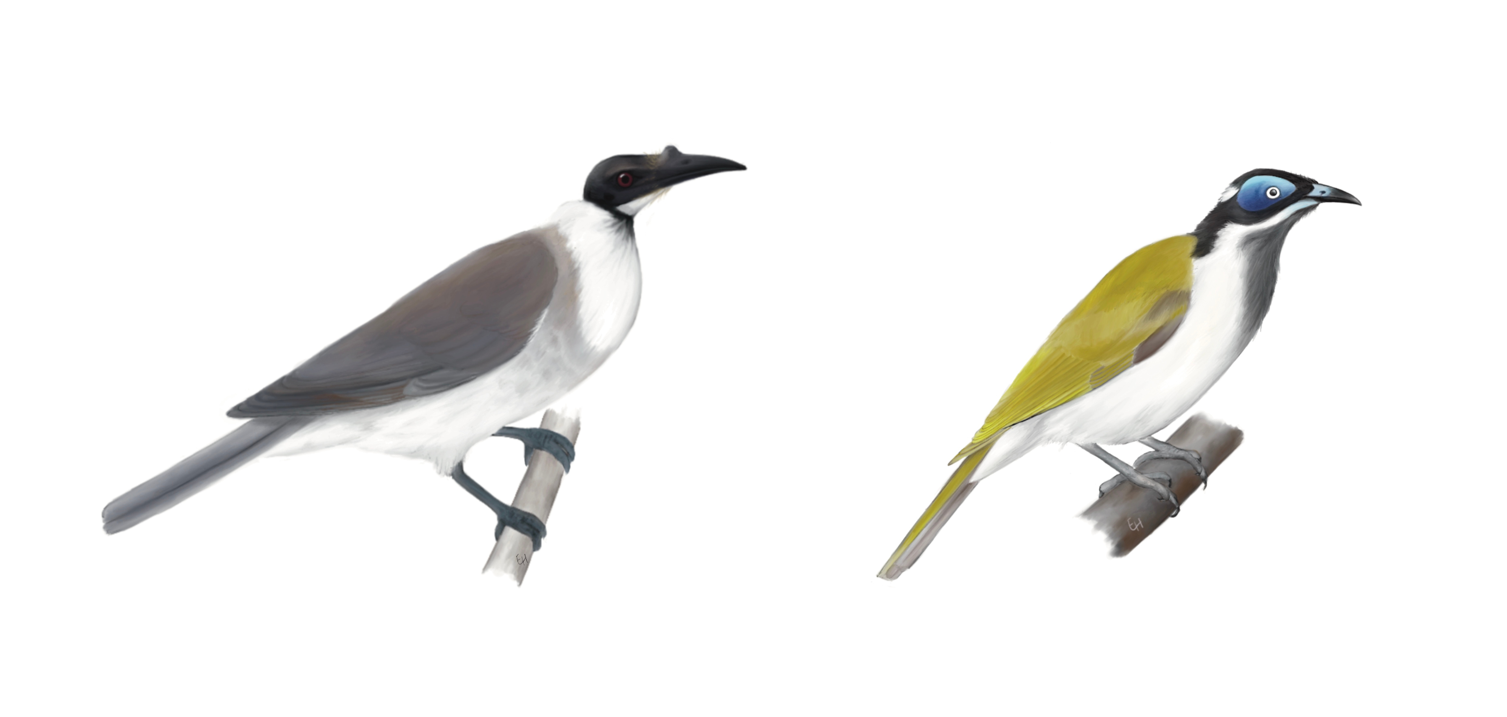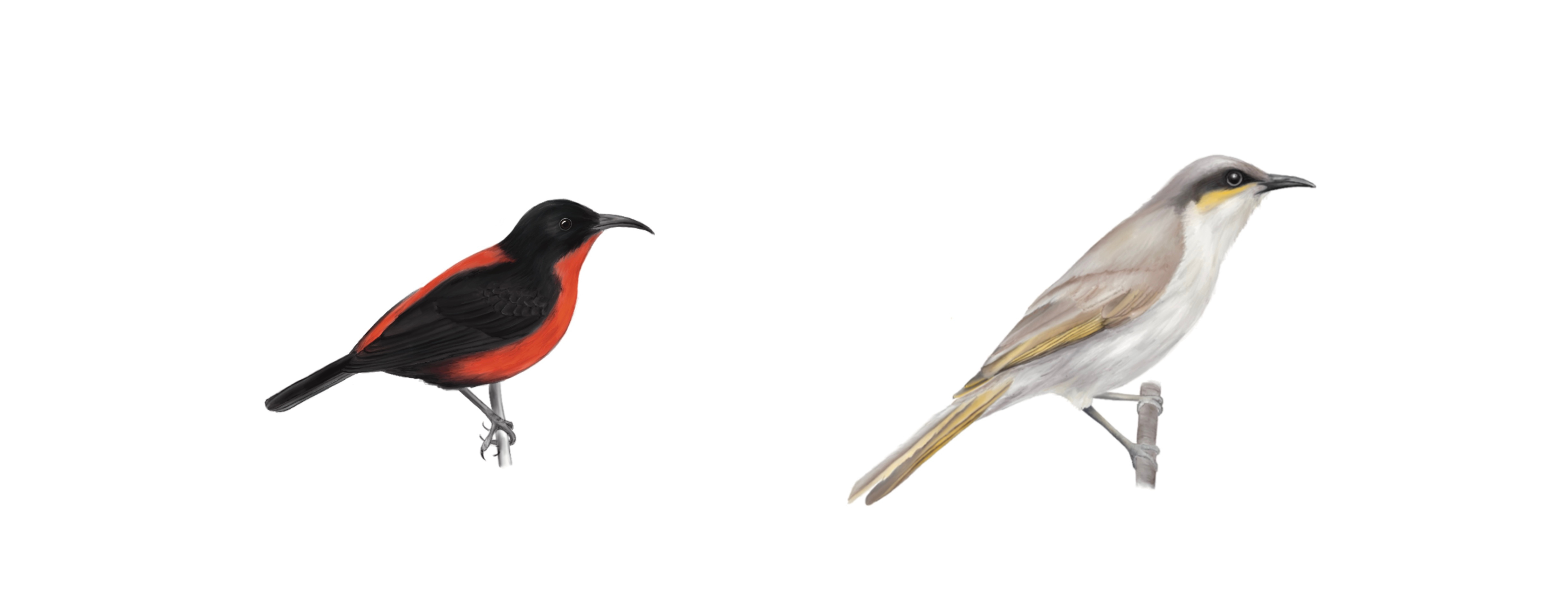 As Melbourne finally emerged from lockdown and my analyses came to an end, I now not only had a portfolio of honeyeater illustrations, but also some interesting results. Overall, we found that honeyeater speciation rate differs considerably between islands and the continents. Larger range sizes are indeed associated with higher speciation rates on continents, while dispersal ability influences speciation regardless of geographic setting. It turns out that honeyeaters proved Darwin’s original proposal for a positive relationship between range size and speciation likelihood to be right.