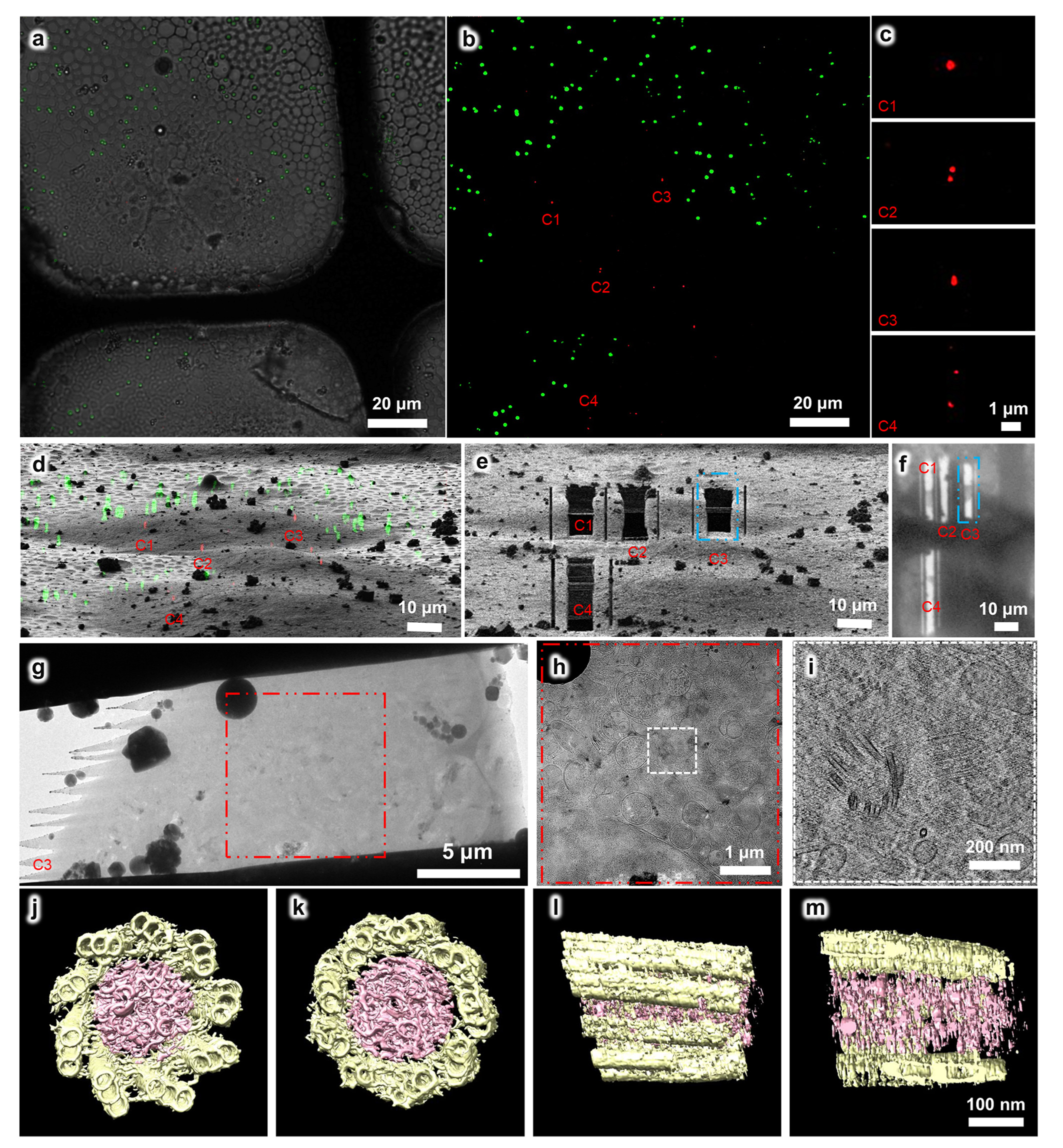 Figure 2. Using the HOPE-SIM-based cryo-CLEM workflow to capture the centrosomes in HeLa cells. (a) Bright field image of the target square is merged with the z projection of HOPE-SIM fluorescent image in (b), where the microspheres (green) are well spread, and the fluorescence-labeled centrosomes (red) are well resolved. Four sets (C1-4) of centrosomes are selected C1-4 for subsequent cryo-FIB fabrication. (c) Zoomed-in view of the four sets of centrosomes in (b). (d) 3D correlation between HOPE-SIM and cryo-FIB images to localize the positions of the selected centrosomes. (e) Cryo-FIB image after fabrication at the positions of C1-4 in (d). The cryo-lamella C3 indicated by the blue dashed rectangle is subjected to cryo-ET data collection. (f) Low magnification (155×) cryo-EM image of the cryo-lamellae in (e). (g) Cryo-EM micrograph of the C3 cryo-lamella with the magnification of 4,300×. (h) Cryo-EM micrograph (8,700×) of the C3 cryo-lamella at the region of the red square in (g). The target region marked by the white square is subjected for cryo-ET data collection and reconstruction. (i) One slice of the tomogram (53,000×) of the target region, showing the target centrioles with one in the top view and another in the side view. (j-m) 3D in situ structure of the centriole in HeLa cells with different views, (j) top, (k) bottom, (l) side and (m) cross. The triplet tubules are shown in yellow, and the internal scaffold structures are shown in pink.