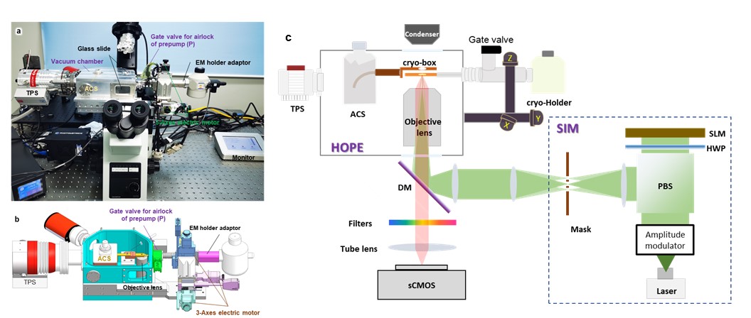 Figure 1. Design and principle of the HOPE-SIM system. (a) A real photograph of an Olympus IX73 inverted microscope with the mounted HOPE-SIM stage. TPS, turbo pump system; ACS, anti-contamination system. (b) Section view of the design of the HOPE-SIM stage. Each part of the system is labeled and described. (c) Schematic overview of the HOPE-SIM system design in its operational mode.