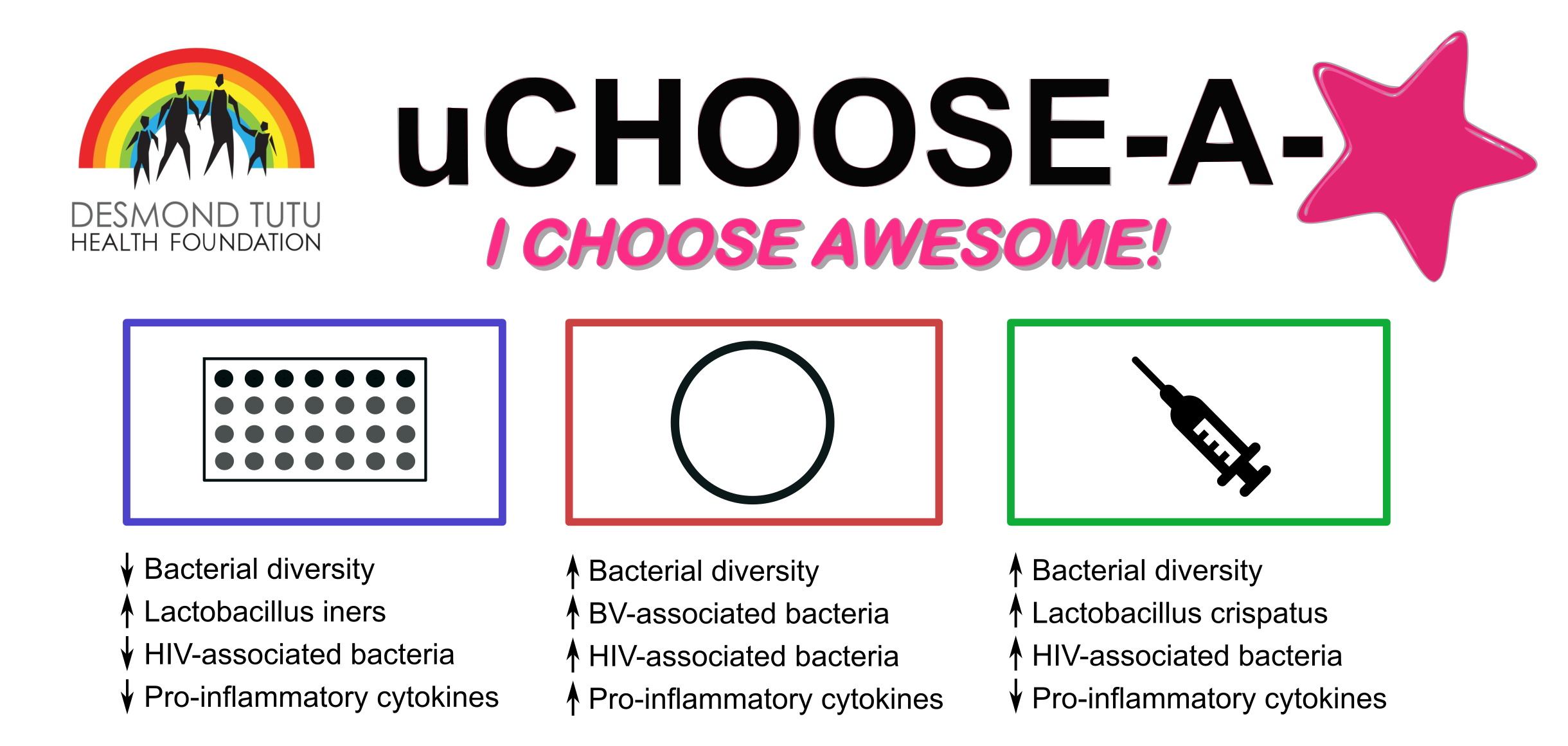 Figure 1. Summary of the microbial and immunological outcomes of the UChoose Add-on Sub-study To Access Risk (uChoose-A-Star), an open-label, randomized trial, evaluating the impact of combined oral contraceptive use (blue, left), combined contraceptive vaginal ring (red, middle) and injectable Net-En (green, right) on the vaginal microbiota and cervicovaginal cytokines in adolescents attending a Desmond Tutu Health Foundation Youth Centre in Cape Town, South Africa. BV: bacterial vaginosis.