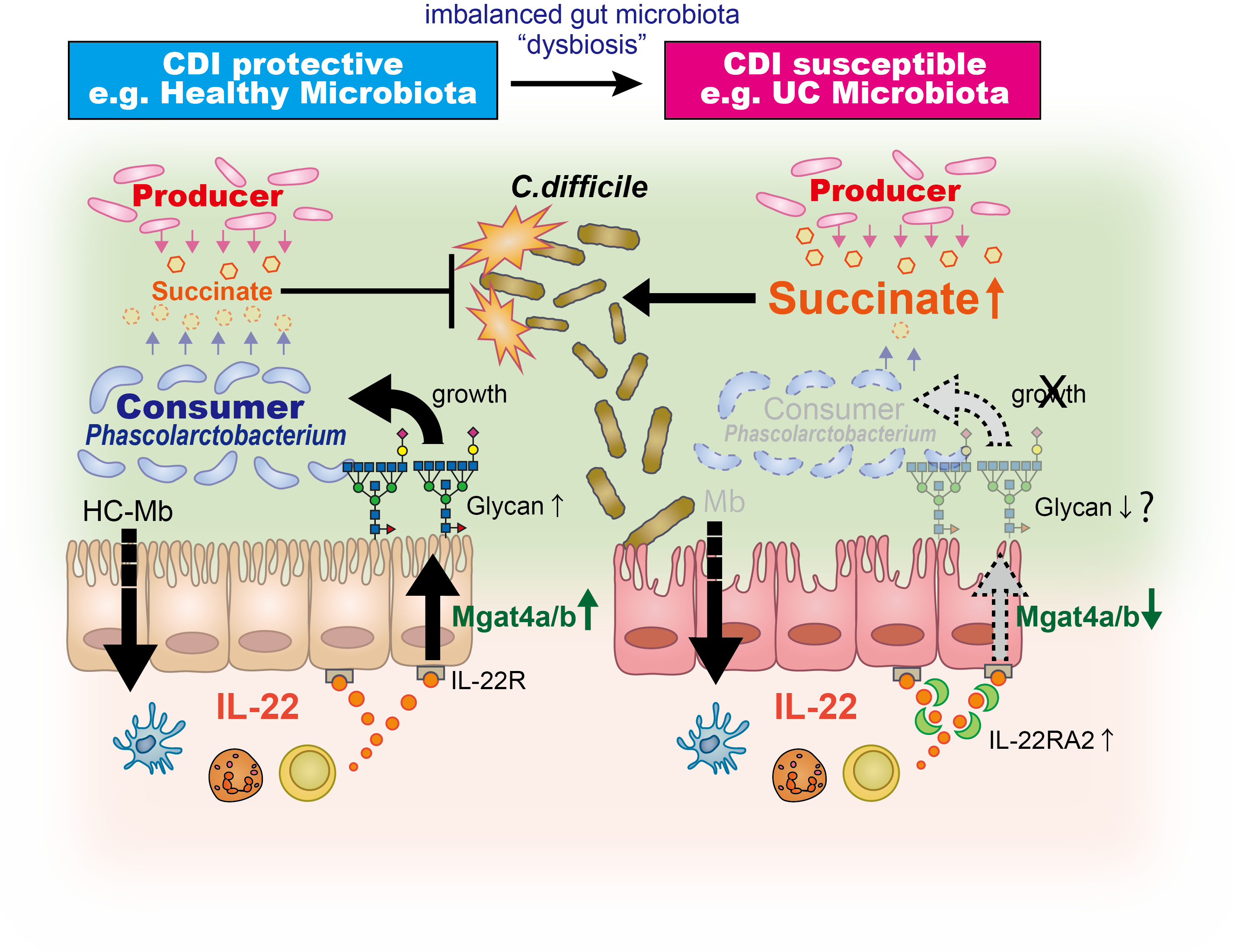 In our paper, published in Nature Medicine, we show that mucosal IL-22 signaling let a competitor of C. difficile gain the upper hand. By utilizing the human-associated microbiota (HMA) mouse model (Nagao-Kitamoto et al., 2016, CMGH), we revealed that IL-22, induced by colonization of human microbiota, plays a critical role in the prevention of C. difficile colonization in the gut. IL-22 regulated host glycosylation confers a benefit to the growth of certain beneficial bacteria, such as Phascolarctobacterium spp., in the gut microbiome. Phascolarctobacterium consumes luminal succinate for its growth and thereby reduced the availability of luminal succinate required for C. difficile growth. Moreover, we demonstrated that patients with ulcerative colitis (UC) who are susceptible to CDI might have a defect in host glycosylation. Consistently, UC-HMA mice were susceptible to CDI, but this phenotype was restored by transplantation of Phascolarctobacterium via the reduction of luminal succinate levels. Thus, IL-22-mediated host glycosylation guides the growth of metabolic competitors for C. difficile, thereby preventing the growth of this pathogen in the gut.