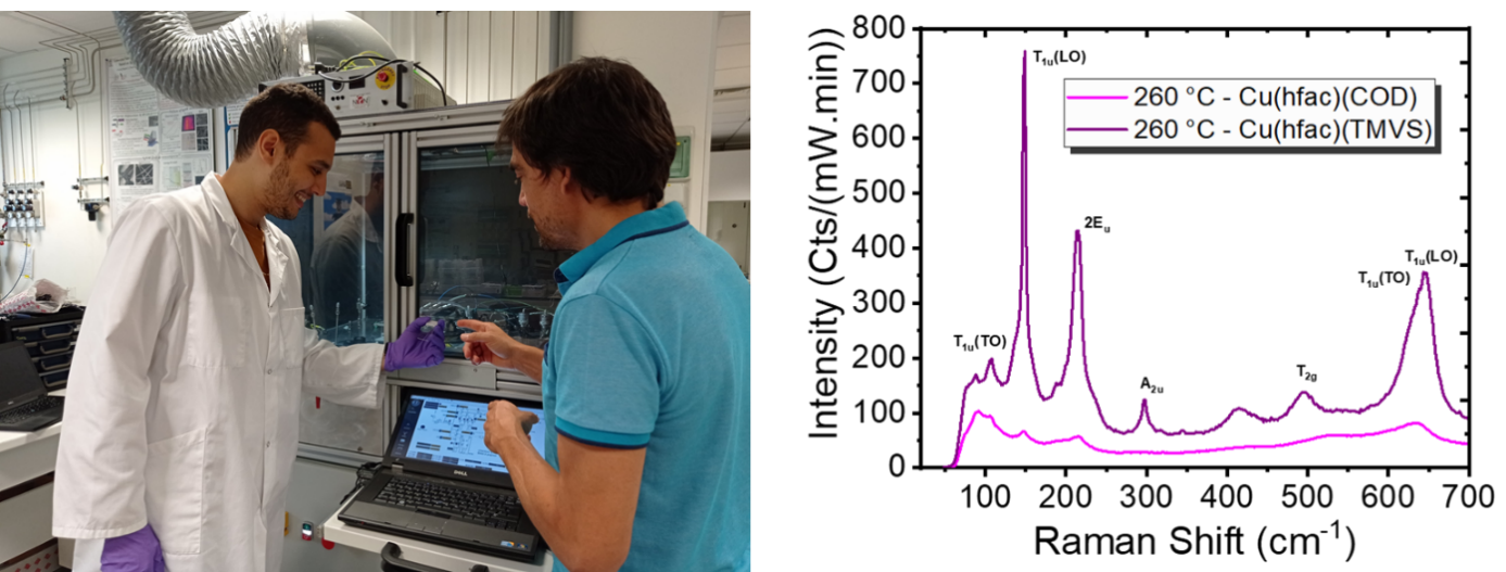 This initial work was taken over by Ph.D. student Abderrahime Sekkat (in front or our home-made SALD system in the image in Figure 1), whose thesis focuses on Cu2O based energy devices. To our surprise, the Cu2O thin films deposited with the new solid precursor showed even better transport properties. As detailed in our Nature Materials Communications paper, mobility values above 90 cm2/Vs (i.e similar to those obtained in Cu2O single crystals) have been obtained for films deposited at 260 °C (mobility values obtained at 180 °C being around 30 cm2/Vs).5 This was again an excellent result but, still, we had no clue why SALD Cu2O films were so good. This is where Raman spectroscopy came to the rescue. Although Raman Spectroscopy is commonly used to probe the crystalline phase of oxides, in the case of Cu2O, it provides a key insight into the defects present in the material. This had been recently demonstrated in an insightful work by T. Sander,6 who showed that the Raman spectrum of Cu2O should contain very few peaks. The extra peaks observed are indeed caused by a perturbation of the symmetry as a result of the presence of defects. We could see that as the deposition temperature increased, the peaks associated with defects (in particular Cu vacancies, see the paper for details) decreased, which results in enhanced mobility. Raman data thus allowed us to understand why films made from both precursors at the same temperature showed such different transport properties (orders of magnitude difference in mobility), just by taking a look at the intensity of the peaks related to defects in the Raman spectra (see Figure 1).