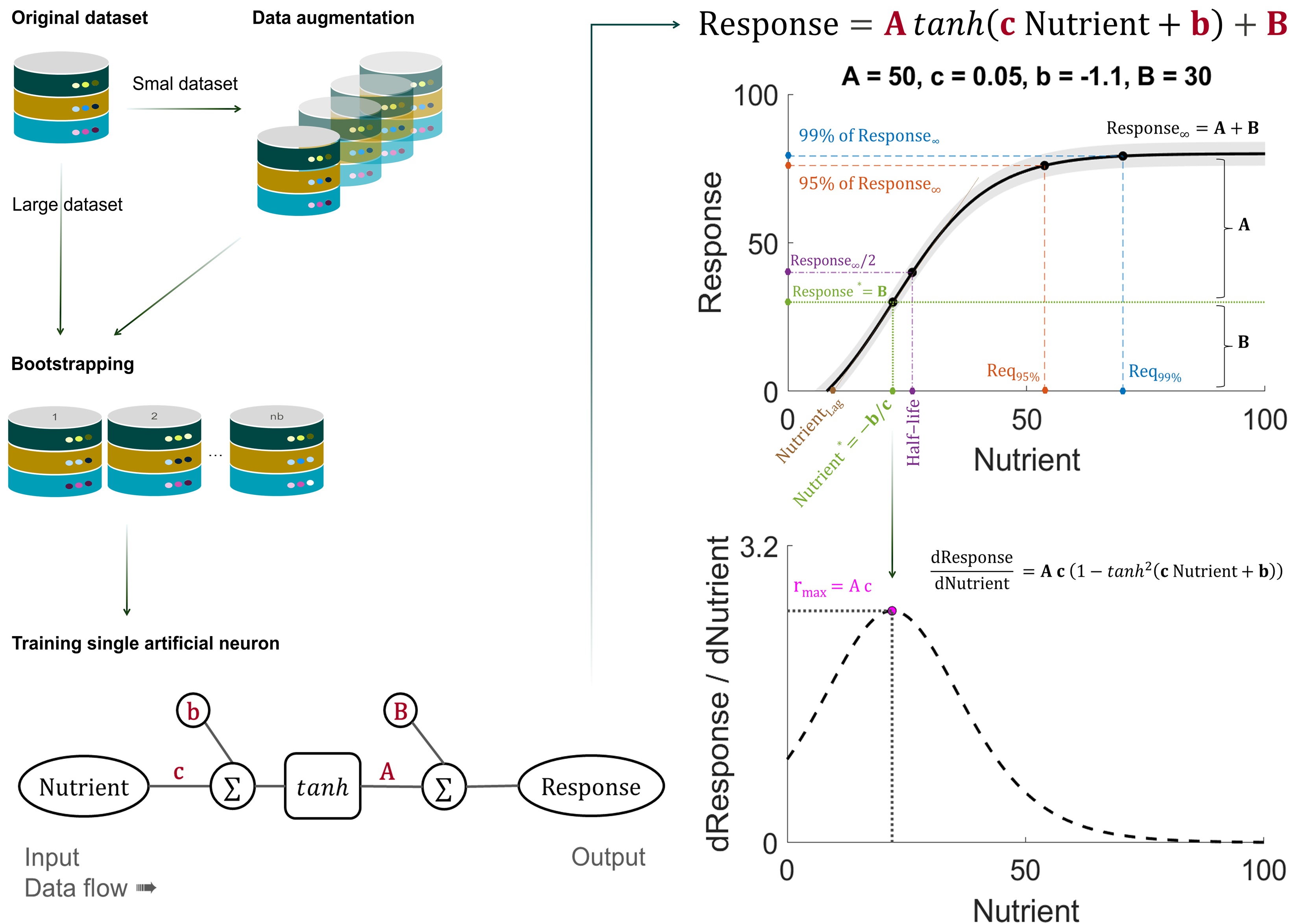 We built a model using just one artificial neuron—the simplest kind of “brain cell” a computer can have. Think of it like a smart thermostat: it takes in how much nutrient you feed, and it predicts how much the animal will grow. But unlike big, mysterious AI/ML systems (often called “black boxes”), our neuron is fully transparent. Every number it uses has a real meaning—like “maximum growth,” “inflection point” (where growth speeds up the most), or “nutrient needed for 95% of full growth.”