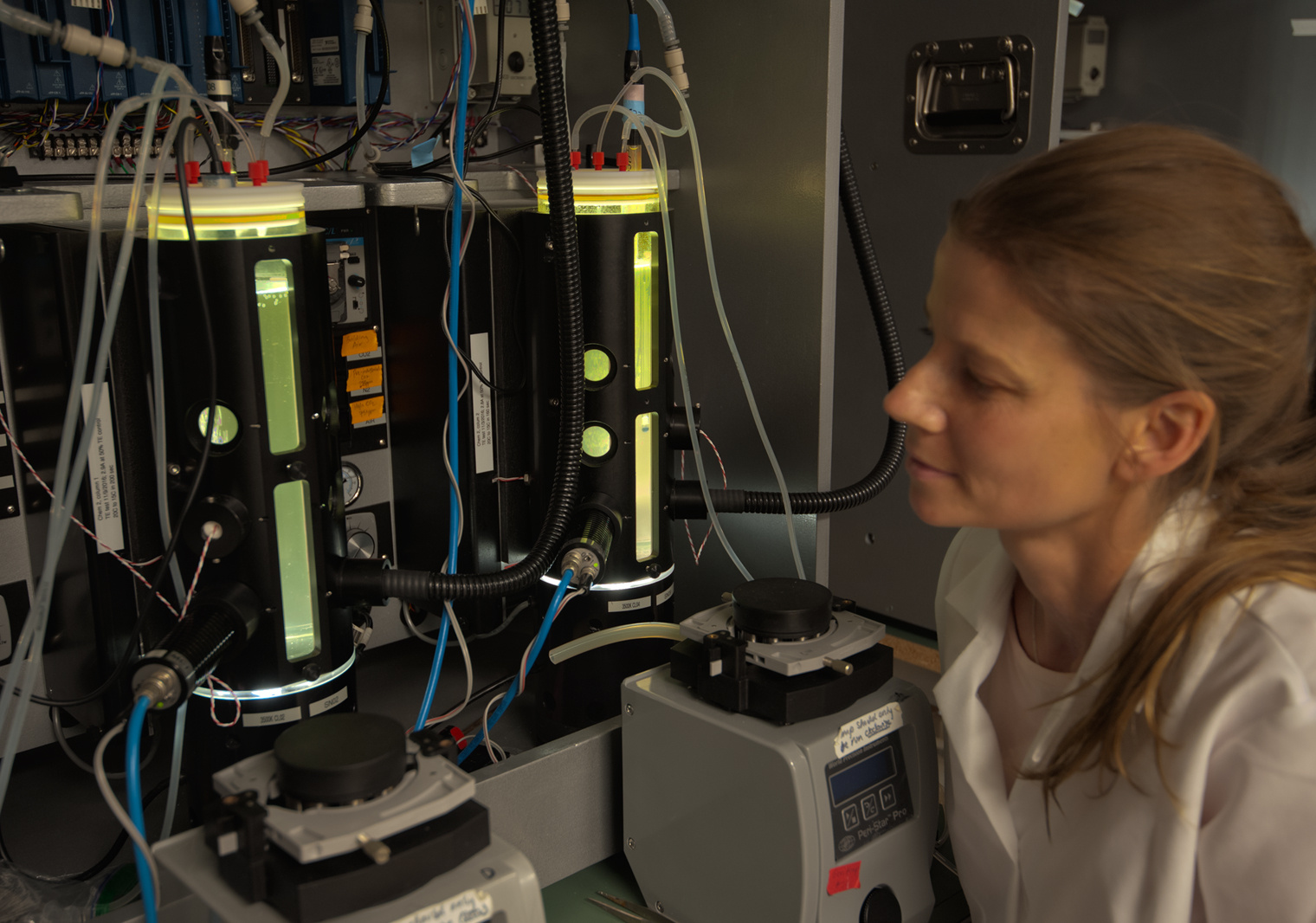Our goal was to understand how eukaryotic algae deal with this competitive environment. We set our bar at: working with an environmentally-relevant emerging model system, working at phosphate concentrations one might measure in the open-ocean, and looking at biological processes of living, actively GROWING cells – whose growth was limited by phosphate – a nutrient we know is depauperate in much of the North Atlantic after springtime. What can be done more readily in the lab is to observe the transition to starvation – but let’s face it – if you are not growing out there you are toast! Someone will come along and gobble you up – end of the line, bloom demise or some other awful fate. Our bar required that we implement a high-tech system for providing a continuous supply of medium (in and out-flow, sterile) and then why not also have fully adjustable temperature, CO2, light and frequent measurements of photosynthetic activity? So that is the photo-bioreactor system we worked with, alongside performing proteomic, RNA-seq and biophysical analyses.