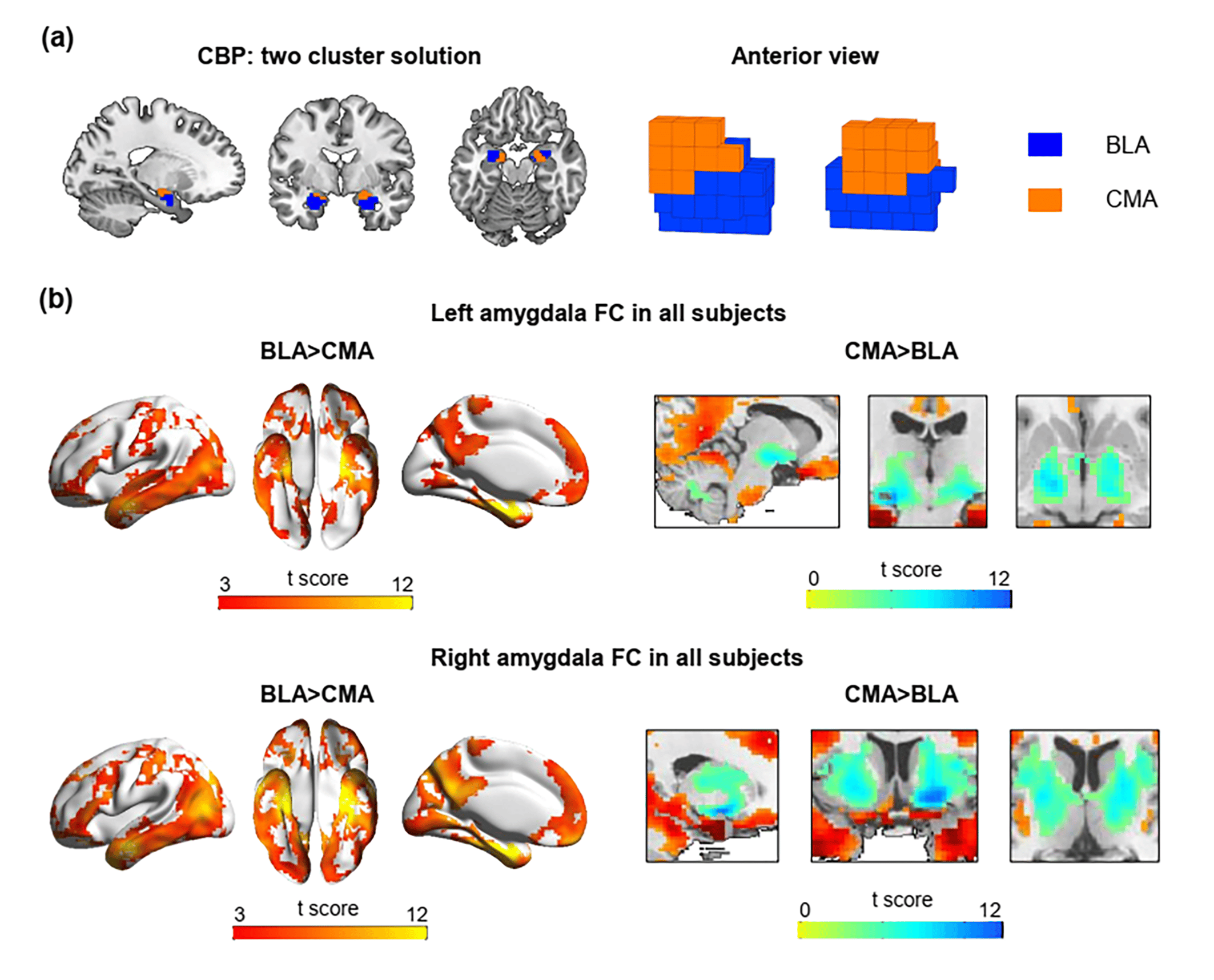 Figure 1 Connectivity-based parcellation of the amygdala. (a) The two-cluster solution derived by connectivity-based parcellation (CBP). (b) The basolateral cluster (BLA) connectivity was primarily cortical, whereas the centromedial cluster (CMA) connectivity was primarily subcortical. Warm color (red) indicates that BLA connectivity is stronger compared to CMA connectivity whereas cool color (blue) indicates CMA connectivity is stronger compared to BLA connectivity.