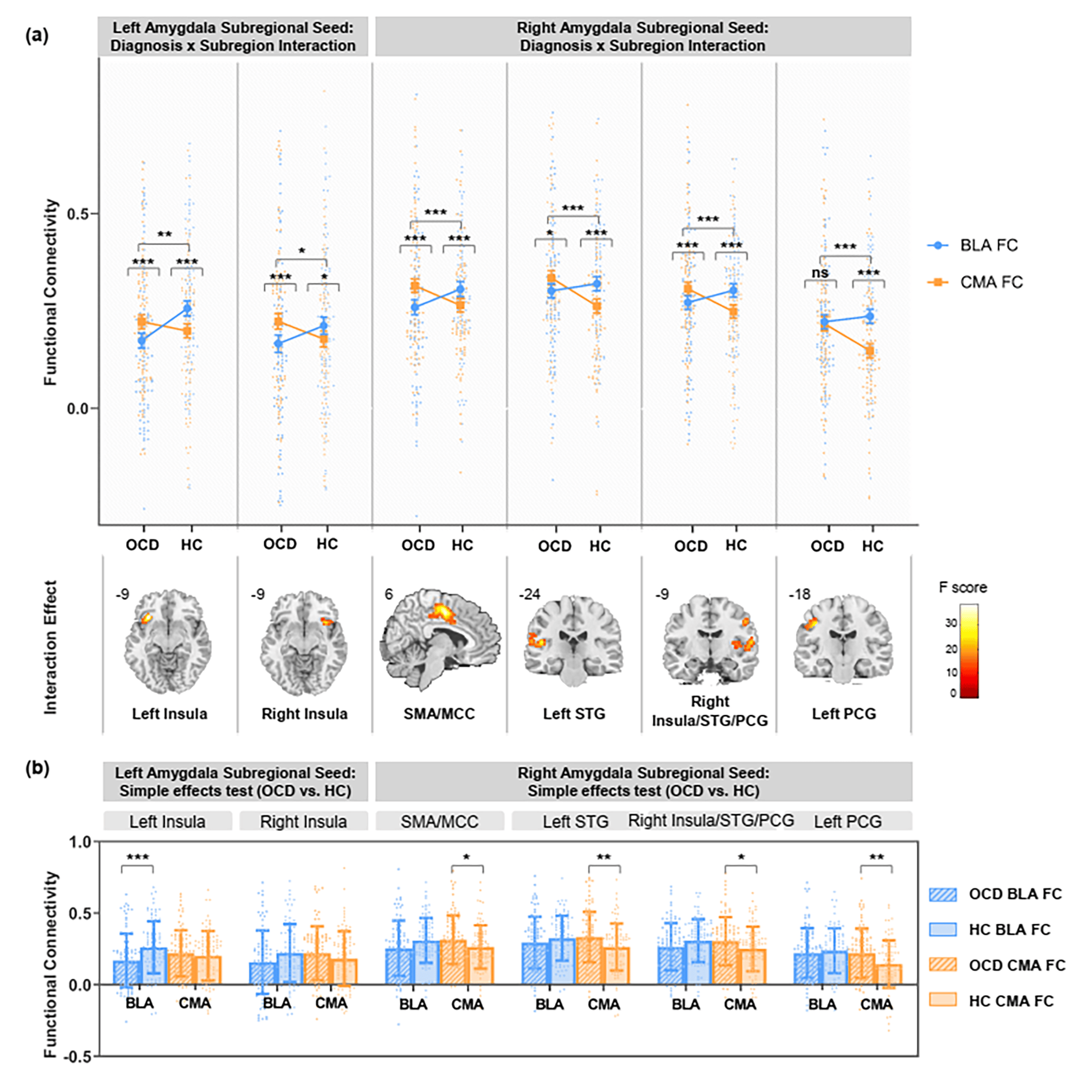 Figure 2 Amygdala subregional functional connectivity in OCD and HC. (a) Significant interactions between diagnosis (OCD vs. HC) and subregion (BLA vs. CMA) computed separately in left and right amygdala. Error bars represent standard errors of the means. (b) Simple effects tests comparing functional connectivity (FC) between OCD versus HC in each subregion. Significance is indicated for uncorrected *p<.05; **p<.01; ***, p<.005. Error bars represent standard deviation. n=182 biologically independent samples were used to derive statistics. MCC, midcingulate cortex; PCG, postcentral gyrus; SMA, supplementary motor area; STG, superior temporal gyrus.