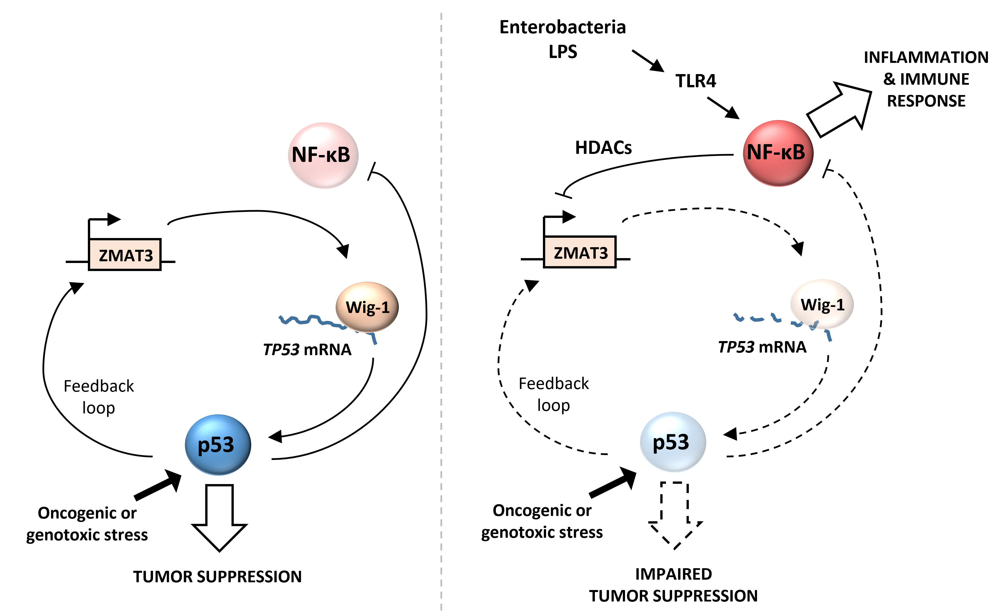 Overall, our results suggest that ZMAT3-p53 feedback loop could act as a molecular switch between NFκB and p53 signaling during inflammation. As p53 and NFκB are two antagonistic pathways, inhibition of p53 could be an important step to allow a proper NFκB activation and inflammatory response to bacterial infections. On the other hand, this inhibition of p53 could create a pro-tumorigenic environment, especially in the context of chronic inflammation.