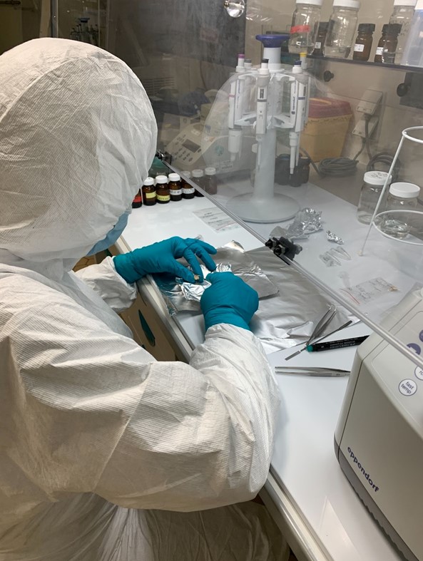 Eden Hill, a biomolecular archaeology Ph.D. candidate at the Max Planck Institute for Evolutionary Anthropology, subsampling ancient dental calculus for analysis. Dental calculus is analyzed in a clean environment to help reduce possible sources of contamination. (Image credit: Ashley Scott)