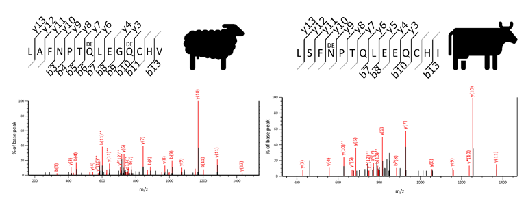 Example MS2 of a beta-lactoglobulin peptide derived from milk, showing species-specific sequence differences between sheep and cattle. (Image credit: Ashley Scott)