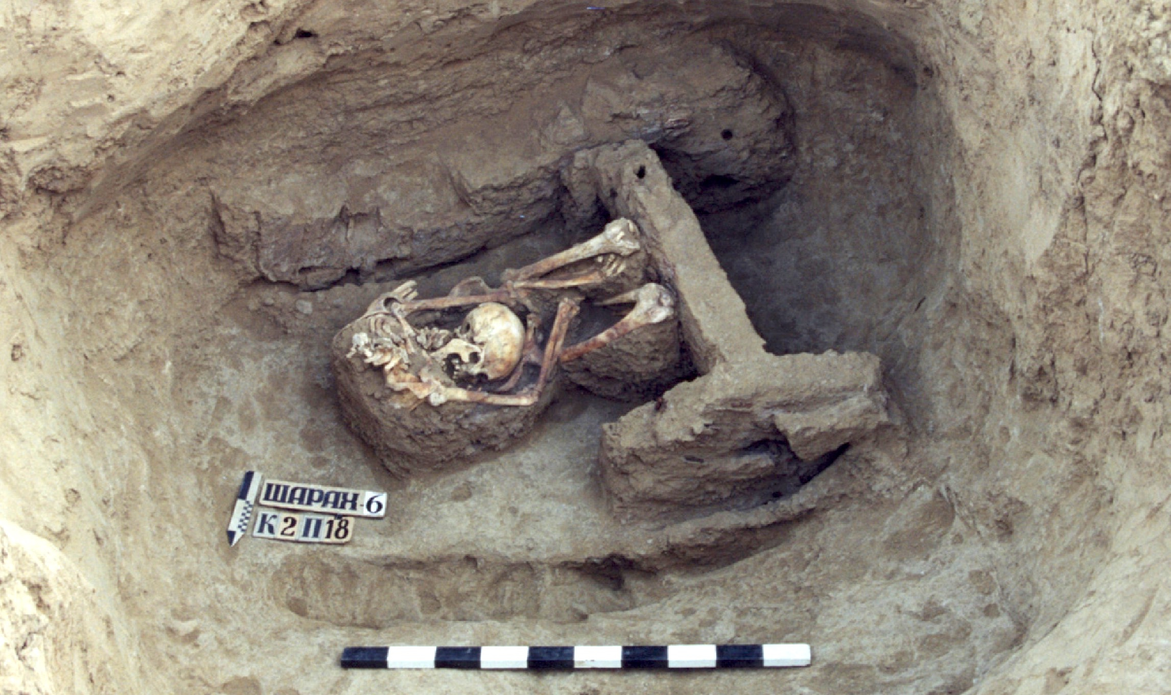 Grave 18 from Mound 2 at the Sharakhalsun 6 kurgan cemetery. This man was buried seated on his wagon, which is the oldest dated wooden wagon known to date. Our findings show that he likely used his wagon to herd large flocks of sheep, from which he derived the dairy products that made up his diet. (Image credit: A. V. Yakovlev. Image credit: Nasledie, Stavropol)