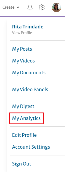 The analytics for your posts can be accessed from the profile drop-down menu in the top right corner (under your profile photo). You can navigate to the analytics page by clicking on the ‘My Analytics’ tab.