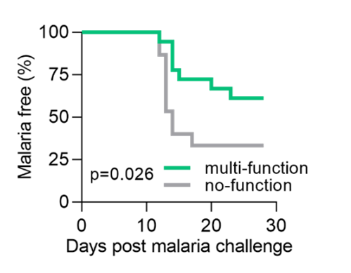Importantly, we found that vaccinated participants who had higher levels of functional antibodies had a reduced risk of developing malaria parasitemia following experimental infection challenge. These findings suggest that achieving better induction of antibody Fc-dependent effector functions (interactions with complement and Fc-receptors on immune cells) could be a promising and feasible strategy to achieve higher vaccine efficacy.