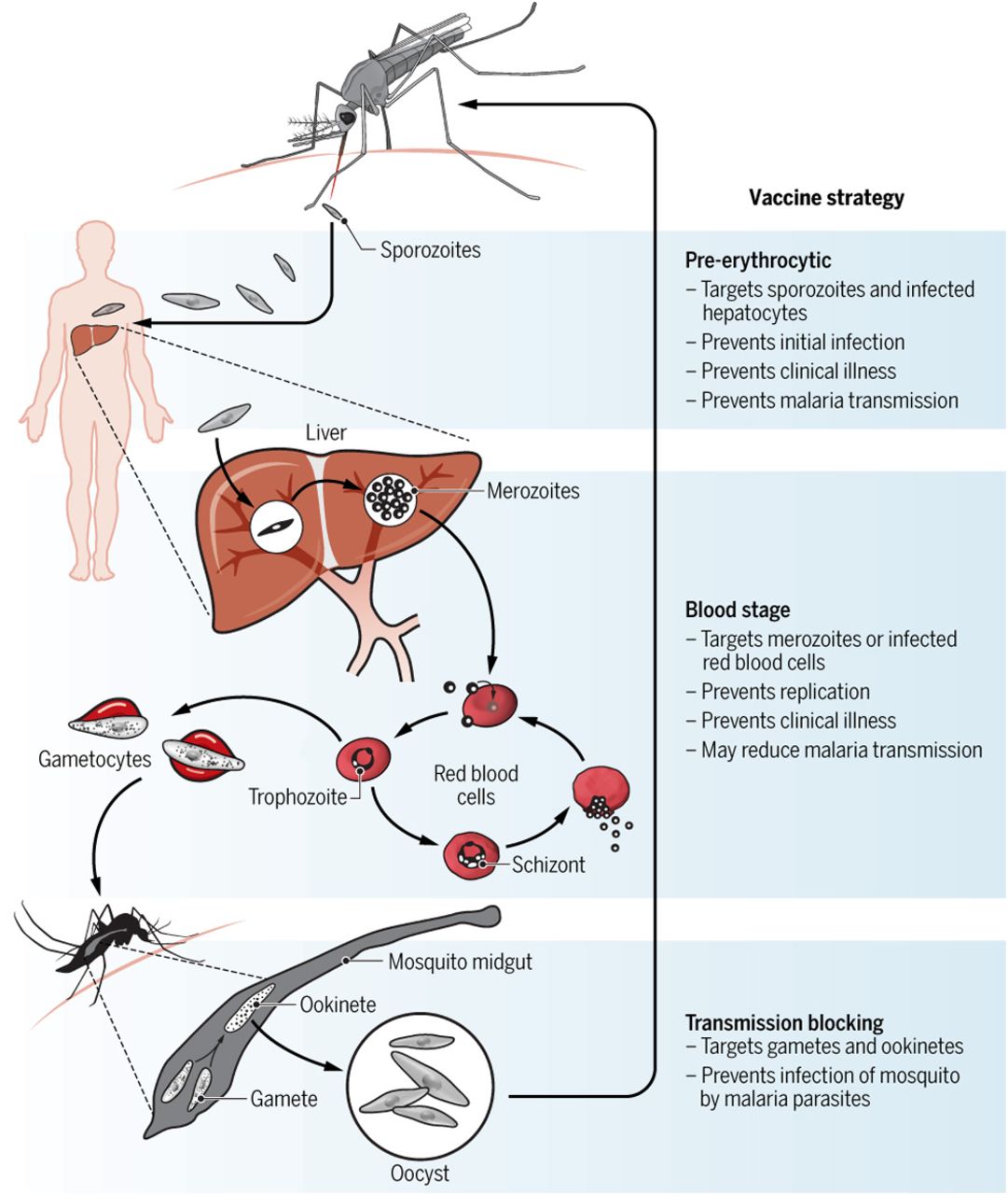 Figure: Targets of malaria vaccine strategies. The RTS,S vaccine targets sporozoites (from Beeson JG et al, Science Translational Medicine, 2019. Vol. 11, Issue 474, eaau1458)
