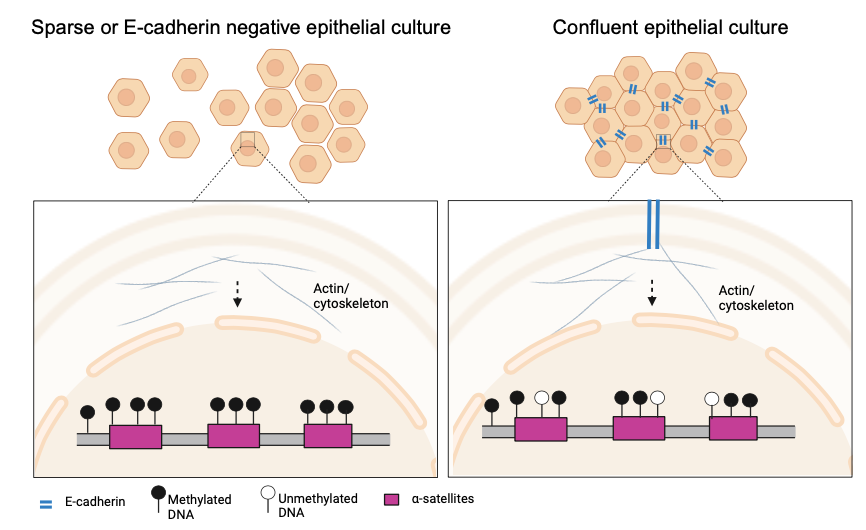Delving deeper, we turned our attention to the role of cell-cell interactions in this process by focusing on the transmembrane protein E-cadherin. E-cadherin helps form adherens junctions, enabling epithelial cells to stick together. Our experiments showed that disrupting the function of E-cadherin, either through genetic knockdown or by blocking its function, resulted in a marked increase in DNA methylation at the α-satellite repeats. This required an intact actin cytoskeleton. Notably, this mechanism was absent in cancer cells lacking E-cadherin expression and the proliferation of which is not inhibited by cell-cell contacts.