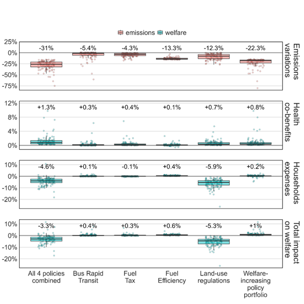 In our study, we measured the impact of four city-level transport policies on emissions mitigation, as well as their effects on various components of well-being, including housing and transport affordability, public finance, air and noise pollution, road accidents, and physical exercise. Our findings suggest that a combination of polluting transportation taxation, land-use regulations, investments in public transport, and vehicle electrification could reduce transportation GHG emissions by up to 31% in 15 years across the 120 cities studied. However, we also found that the health co-benefits from transportation mitigation policies did not fully compensate for their monetary costs, leading to negative impacts on population well-being.