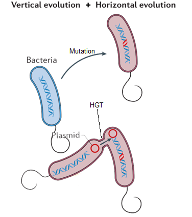 Fundamentally, bacteria can evolve resistance through two mechanisms: the alteration of existing genetic material in their genomes (vertical evolution) or via the acquisition of foreign genetic material (horizontal gene transfer or HGT in short).