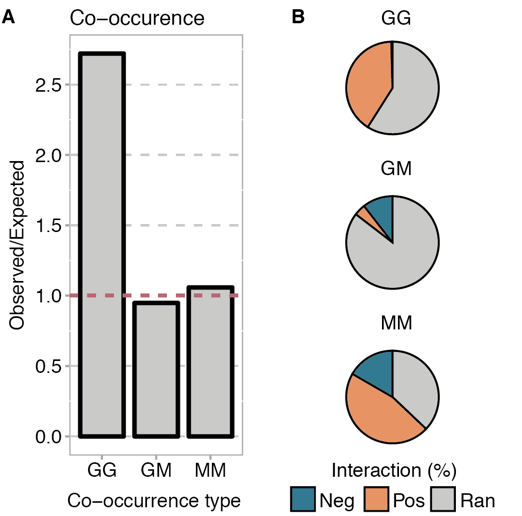 Fig. 2. Co-occurrence of ARGs and mutants in sequenced E. coli genomes. (A) Bars show the observed relative to the expected proportion of gene-gene (GG), gene-mutation (GM) or mutation-mutation (MM) co-occurrence events in ~13.500 sequenced E. coli genomes. (B) The proportion of negative (less frequent co-occurrence than would be expected by chance), positive (more frequent linkage than would be expected by chance) and random co-occurrence events within each interaction category.