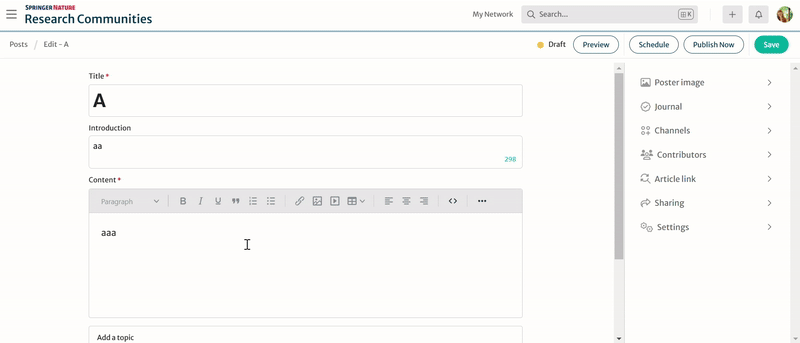 Click on ‘Related Content’ and then simply paste the link to your article and click save. After your post is published, the link will appear as a ‘Explore the Research’ section at the top of the post, which will take users
