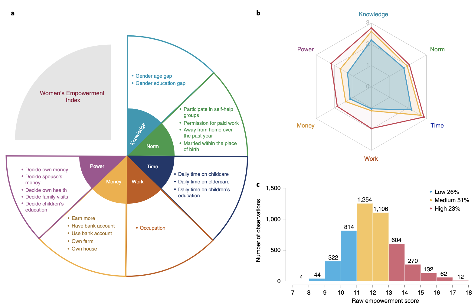 Since households may differ in many unobserved characteristics affecting both energy access and gender-specific outcomes, a naive comparison between males and females across households in the cross-section is likely to yield biased estimates for the gender gap in energy access and use. To address this challenge, we survey women and their spouses in the same household, thus allowing for intra-household comparisons while minimizing the influence of time-invariant unobservables at the household level. To understand how existing power dynamics between men and women in the household affect gender disparities, we build upon existing global instruments to create a Women's Empowerment Index (WEI) to measure the level of gender equality within households in our sample. Our index encompasses six dimensions on Knowledge, Social Norm, Work, Time, Money, and Power. For each indicator, households are ranked as low (1), medium (2), or high (3) empowerment based on their survey responses. Drawing on existing women's empowerment indices, the cutoff for low empowerment is around the 20th percentile and that for high empowerment is around the 80th percentile for each indicator.