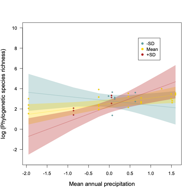 Figure 2. The interaction between precipitation and temperature in predicting fungal pathogen phylogenetic species richness (PSR). PSR increases with precipitation only under higher than average temperature.