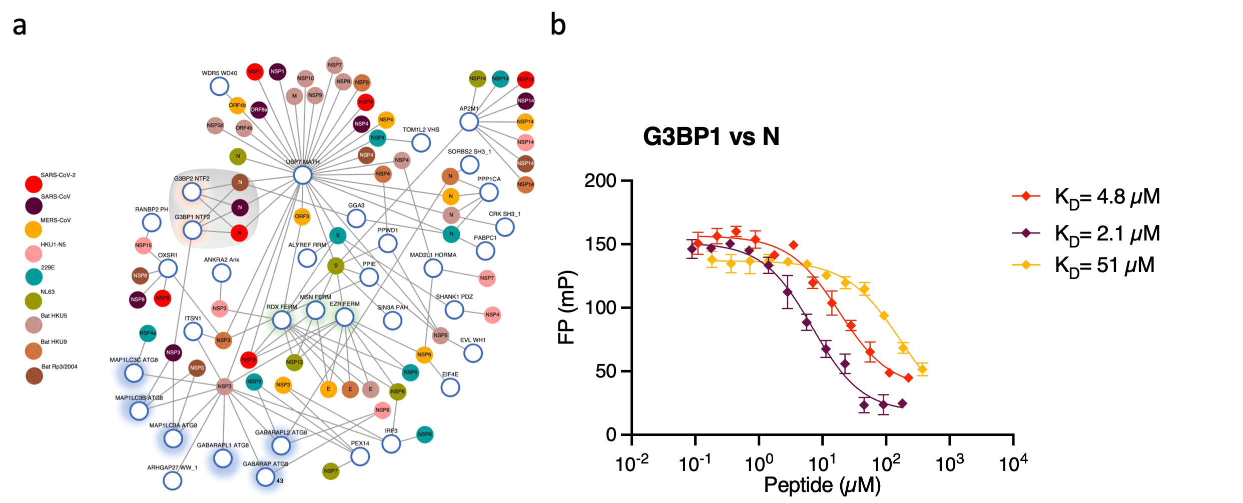 Figure 2 a) Network visualisation of the proteomic peptide phage display results, showing which human bait proteins (blue circles) are hijacked by which coronavirus proteins (as indicated). b) FP results of G3BP1 interacting with peptides from N protein, red: SARS-CoV2, purple: SARS-CoV and yellow: MERS. (Figures adapted from Kruse et al., (2021) (2))