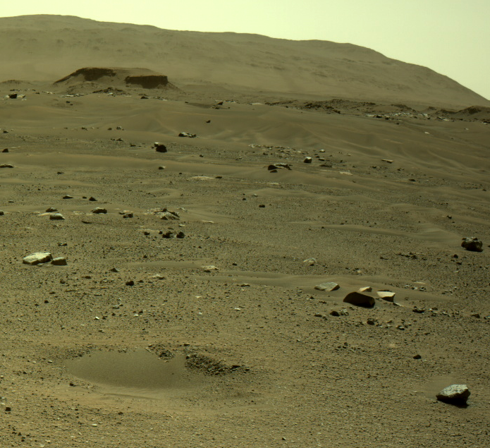 Fig 3. Eroded impact crater partially filled with sand in the foreground. The background shows Kodiak butte, a delta remnant about 1.5 km away, with the main delta formation and Jezero’s rim behind it. The image was taken on martian day (Sol) 109 of the mission. (Image credit: NASA/JPL-Caltech).