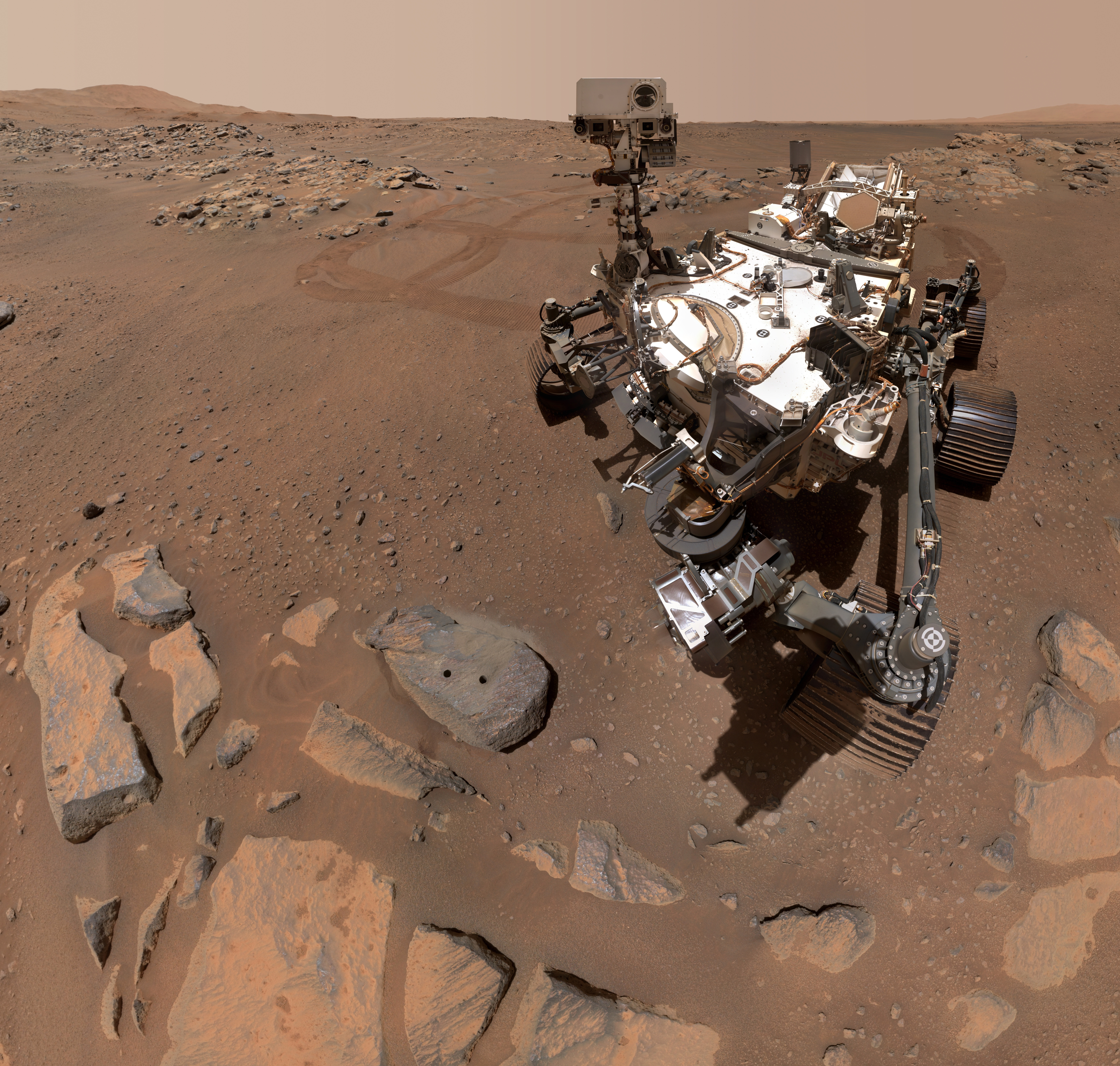 Fig. 2. Selfie of the Perseverance rover at the site of the first sample collection on Mars on a rock named Rochette. Two drill holes can be seen in the rock just in front of the rover. The mosaic was taken on September 10, 2021 on the 198th martian day of the mission. (Image credit: NASA/JPL-Caltech/MSSS).