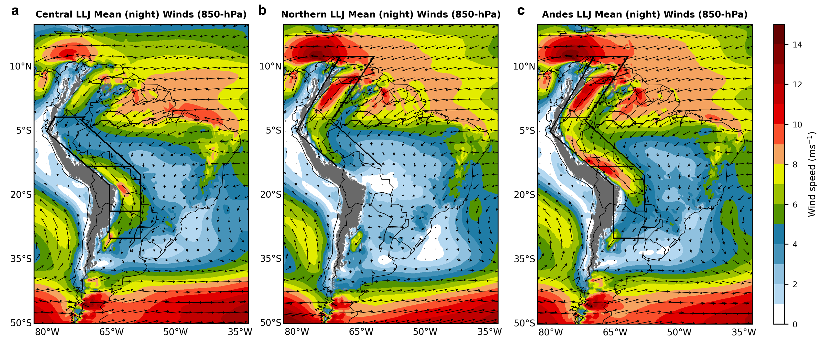 Composites of Mean DJF Nighttime Winds (850-hPa) and spatial domains for (a) Central, (b) Northern, and (c) Andes LLJ types in South America. The color shading indicates wind speed in meters per second with arrows depicting the direction and relative magnitude of the winds. Nighttime corresponds to 23-09 UTC (19:00-05:00 Bolivia local time). Black boxes show the spatial domain masks to identify LLJs.