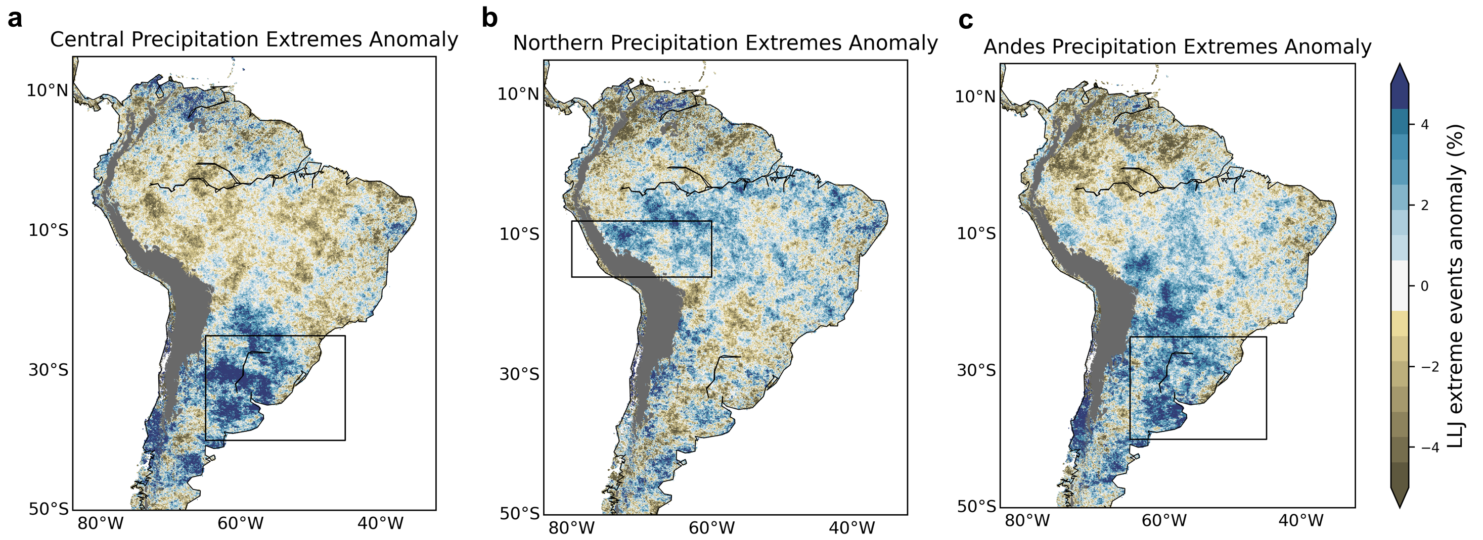 Precipitation extreme anomalies during LLJ types. Daily DJF precipitation extreme anomalies (%) during (a) Central, (b) Northern, and (c) Andes LLJs. Black boxes in (a, b, c) are located downstream from the respective exit regions of the three LLJ types.