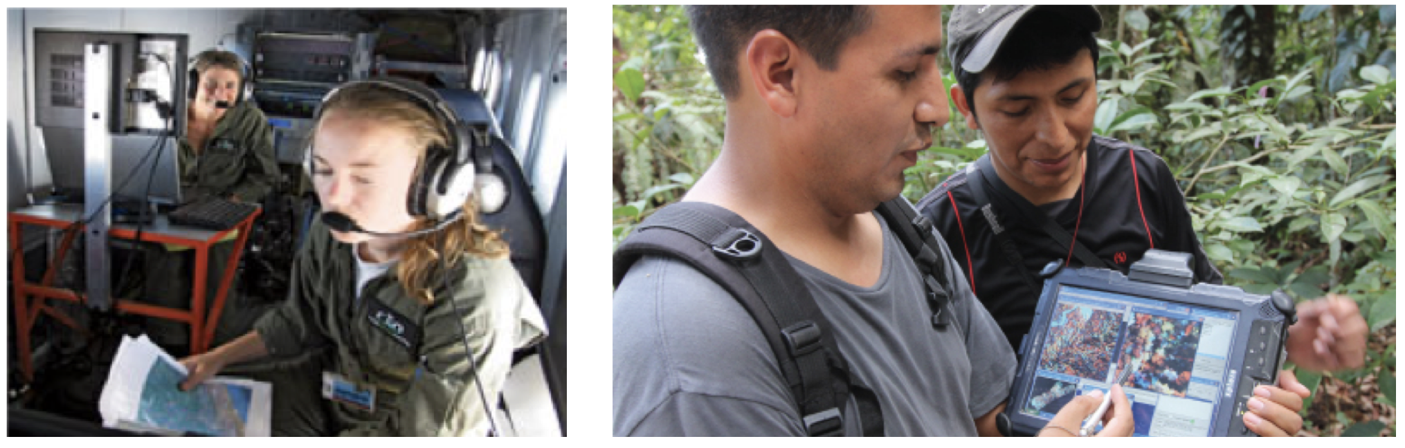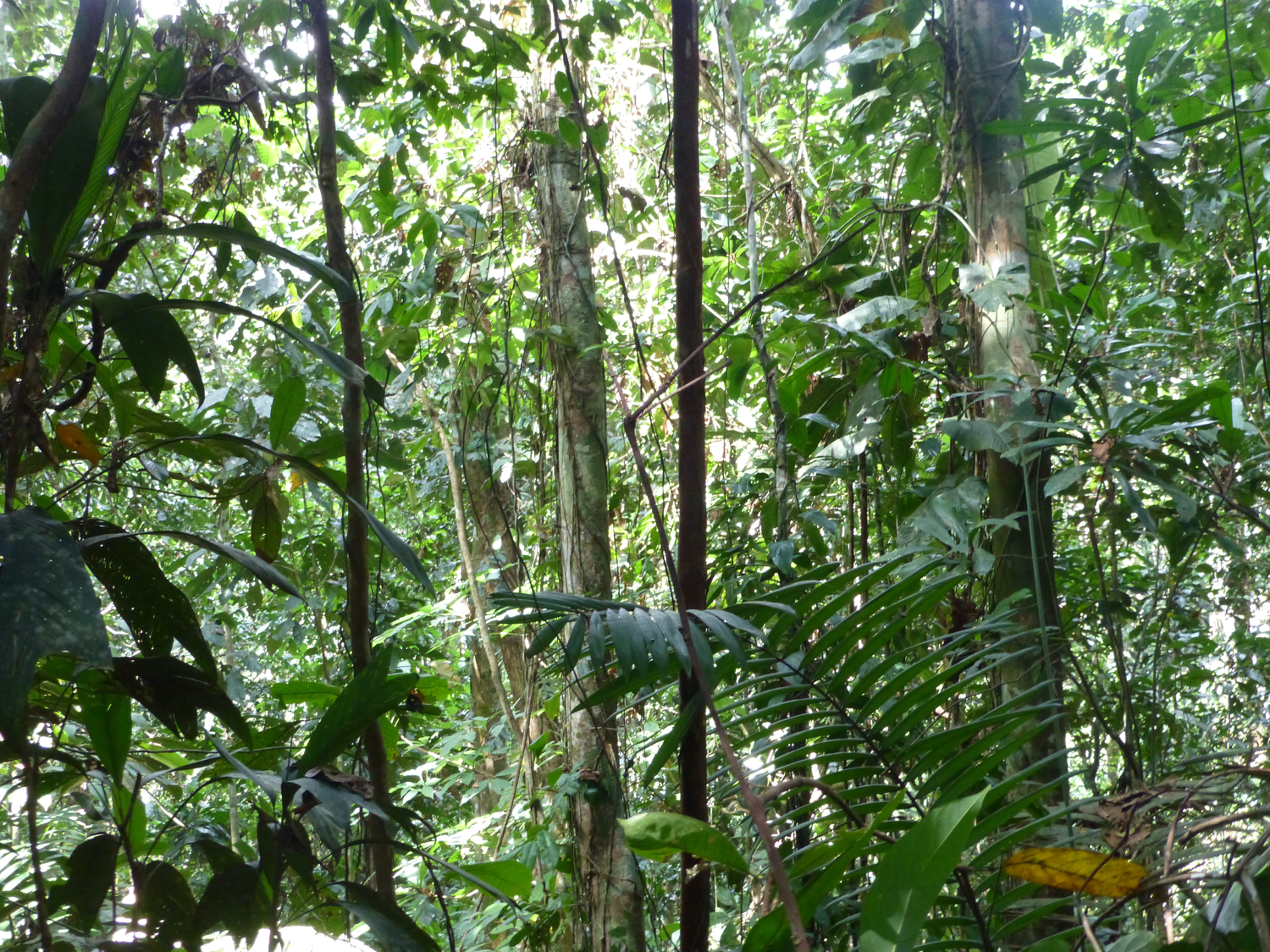 I first visited the field station at Los Amigos in December 2012 with Greg and that is when the idea for this study was born. I had conducted preliminary analyses which indicated some remotely measured spectral characteristics of tree canopies varied along hillslopes, and so we went to the field to check out what we could tell on the ground. However, as anyone who works in these systems knows, tropical forests can be incredibly complex and difficult to understand from the ground – the perspective we get there is like what you see in this picture. This is why coupling airborne remote sensing with on-the-ground field work was so powerful for gaining insight into this system.