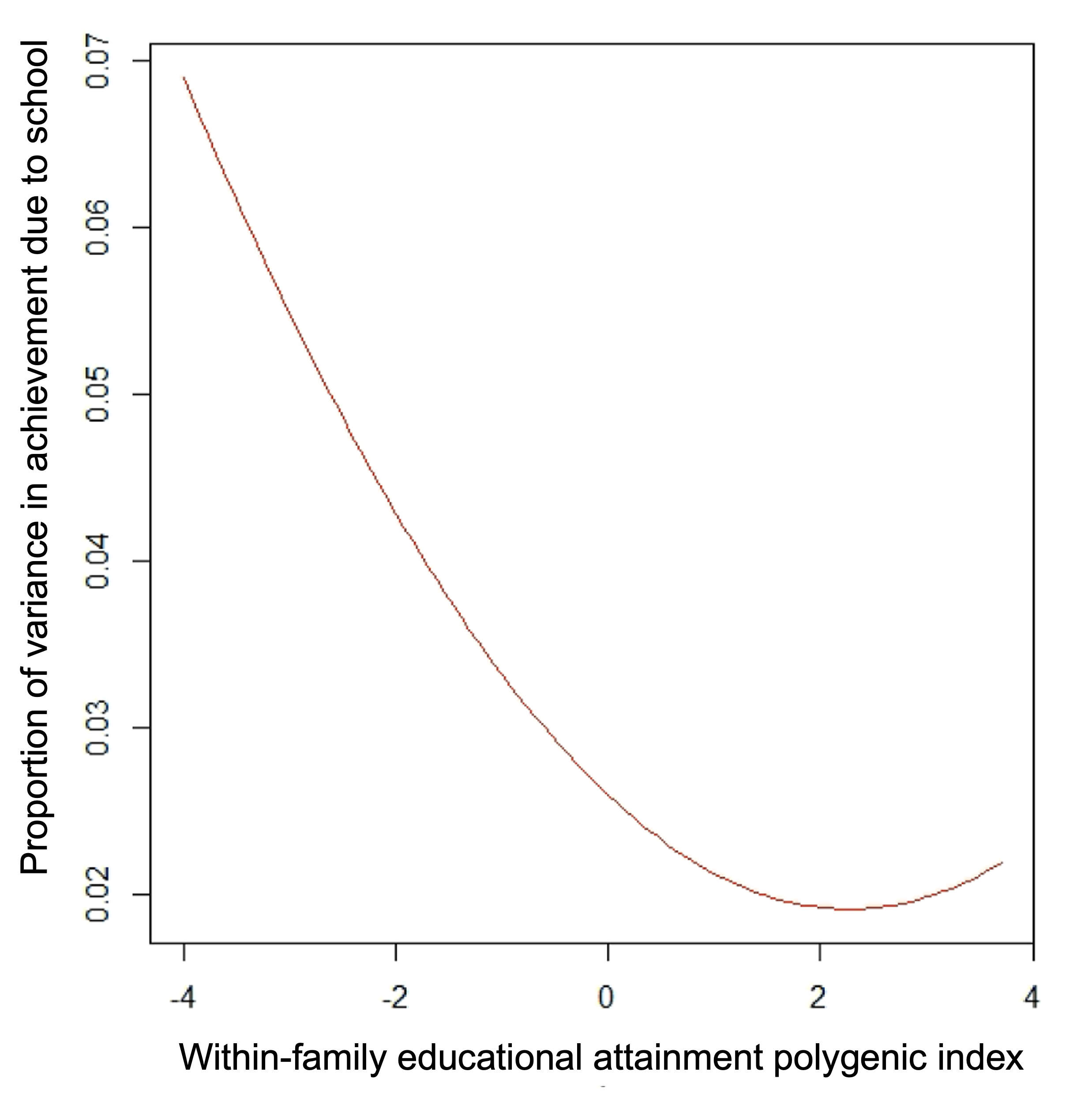 The second figure (below) shows the same result in a different way: not only is the impact of children's genes on achievement dependent on school, but the effect of school is dependent on genes. We see that differences between schools matter more for students with lower education-PGI, explaining 4% versus 2% of the variance in achievement for students whose PGI are 2SD below versus 2SD above the mean. In Norway, almost all students attend public (state) school, and the government has a long track record of redistributive policies to minimise school differences. Nonetheless, Norwegian schools are creating achievement differences between children who are equally unlucky in the ‘Genetic Lottery’, even when family socioeconomic background and all neighbourhood, district and municipality differences are held constant.