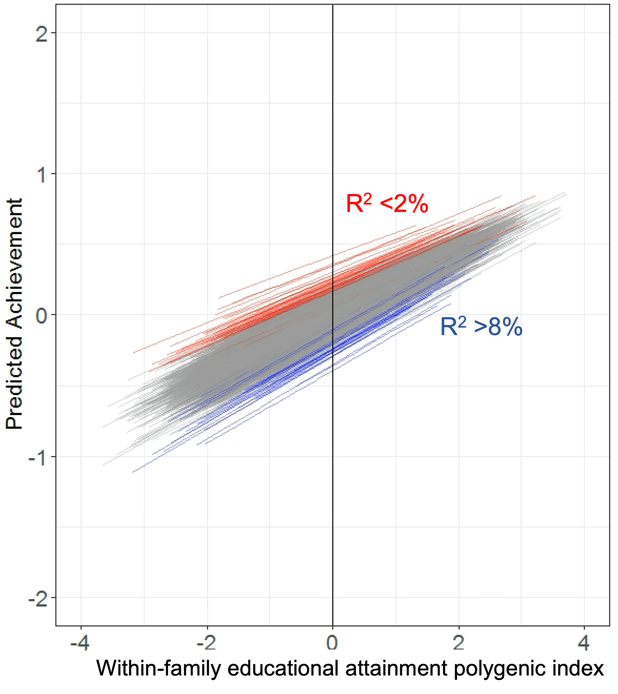 Comparing the blue and red lines, we see that the red lines are all higher up. This tells us that the schools in which differences between children in terms of education-PGI have the least impact on their achievement are those with the best overall achievement. Most children are doing above average. In contrast, the schools where the education-PGI creates more achievement differences between children are the schools with the lowest overall achievement. This suggests that higher-performing schools compensate for children with lower education-PGI. They raise the achievement of those on the lower tail of the PGI distribution, whilst maintaining an overall higher achievement for everyone compared to the other non-red schools.