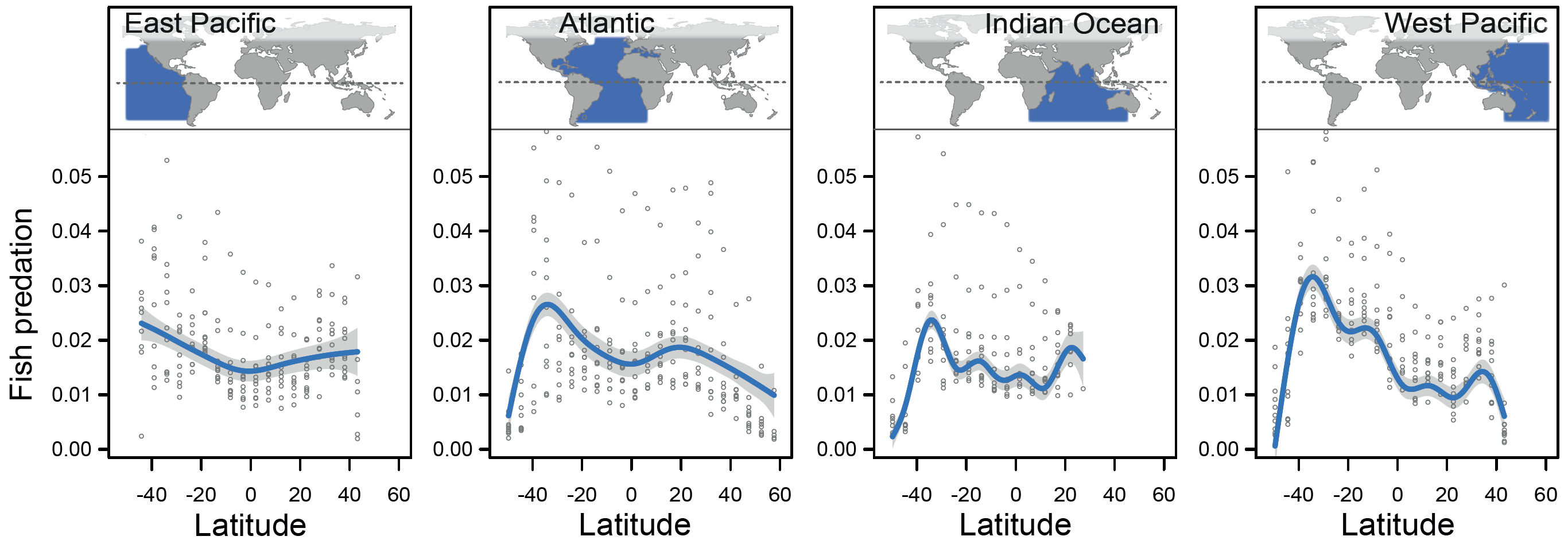 Little did I know that lab meeting on a typical Thursday morning would turn into a multi-year analysis of a global predation dataset that would tackle these issues. We were discussing a paper that tested latitudinal gradients in predation by laying out clay caterpillars in natural habitats and observing if these models were attacked1. While we were debating the merits of artificial versus natural bait, my colleague Marius Roesti wondered if a similar test had been done in aquatic realms. Wouldn’t it be fun to place small fish at thousands of sites globally and see how fast they were eaten? We realized we were describing going fishing for large predatory fish, like tunas, billfish, and sharks. Marius suggested that surely these data existed from long-line fisheries, which have been setting bait fish on hooks in the open ocean for decades, effectively creating the largest replicated test of latitudinal gradients in species interactions.
