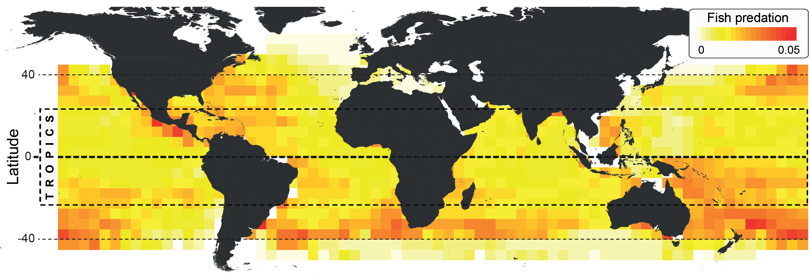 This idea turned into a substantial six-month effort to gain access to global long-line fishery records from four fishery commissions. Ultimately, we attained a dataset with over 900 million documented attacks by large predatory fish. If all these predators were aligned head to tail, we would have a line extending five times longer that the distance between the Earth and the Moon. With this massive 55-year dataset at hand, we tested whether predation is strongest in the tropics and declines towards the poles, and if predation is positively correlated with species diversity.