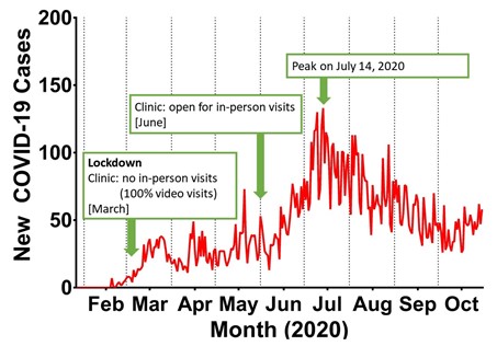 Figure 1. New COVID-19 cases in San Mateo county where the Stanford Pain Management Center is located. Data were obtained from https://www.smchealth.org/coronavirus-health-data