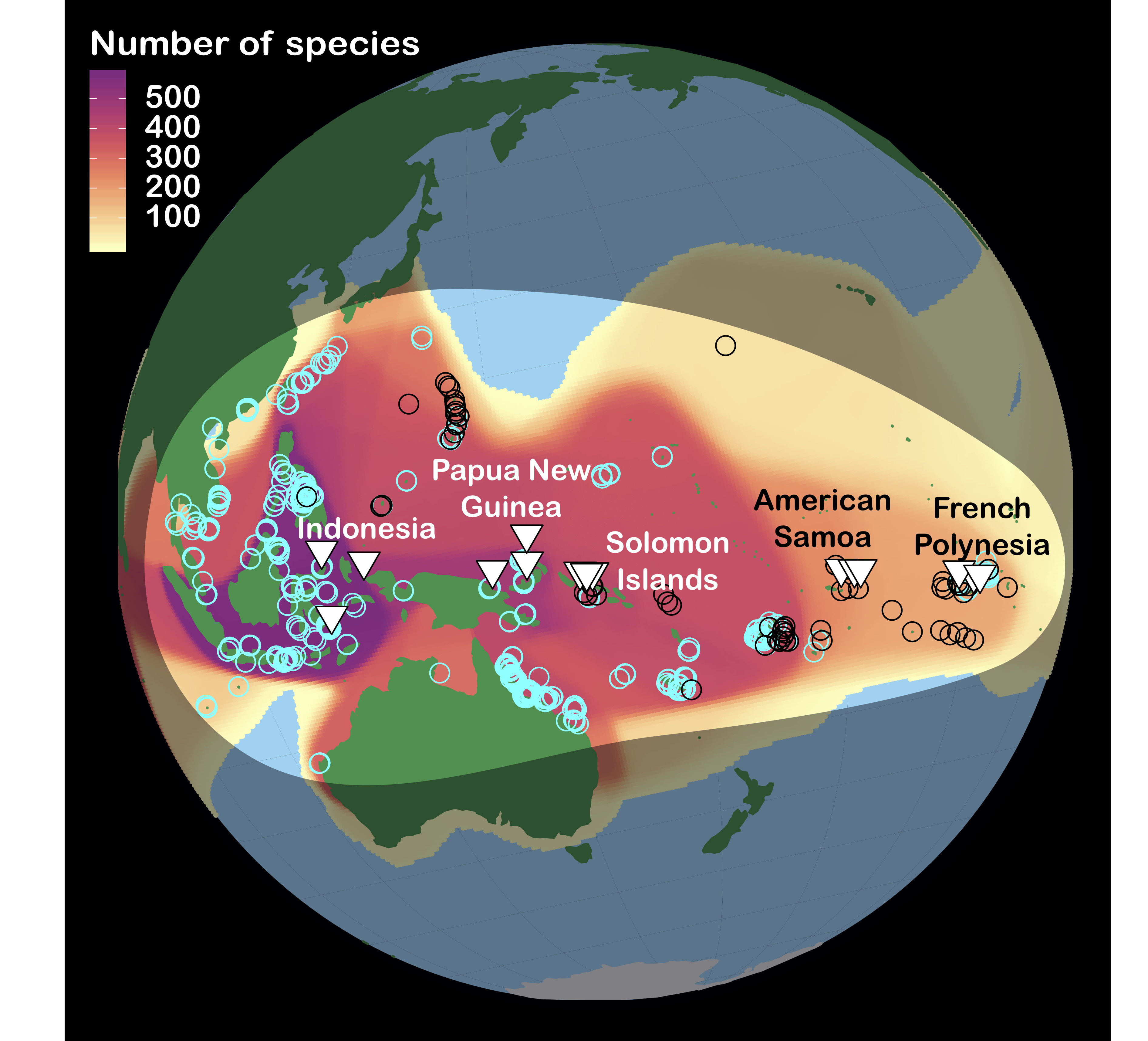 To overcome these challenges, we combined spatial data on the global distribution of coral reefs, detailed maps of coral reef habitat, species abundance data collected across the Pacific, and a new approach to modelling species abundances. The nature of the available data made three things abundantly clear. First, a project like this would not be possible without the generosity of fellow scientists sharing their data. Second, although estimates at such scales are inevitably uncertain, they can reveal valuable and robust insights into the functioning and conservation of our biosphere. And third, science is a work in progress: as more detailed data become available in the future, our estimates will improve.