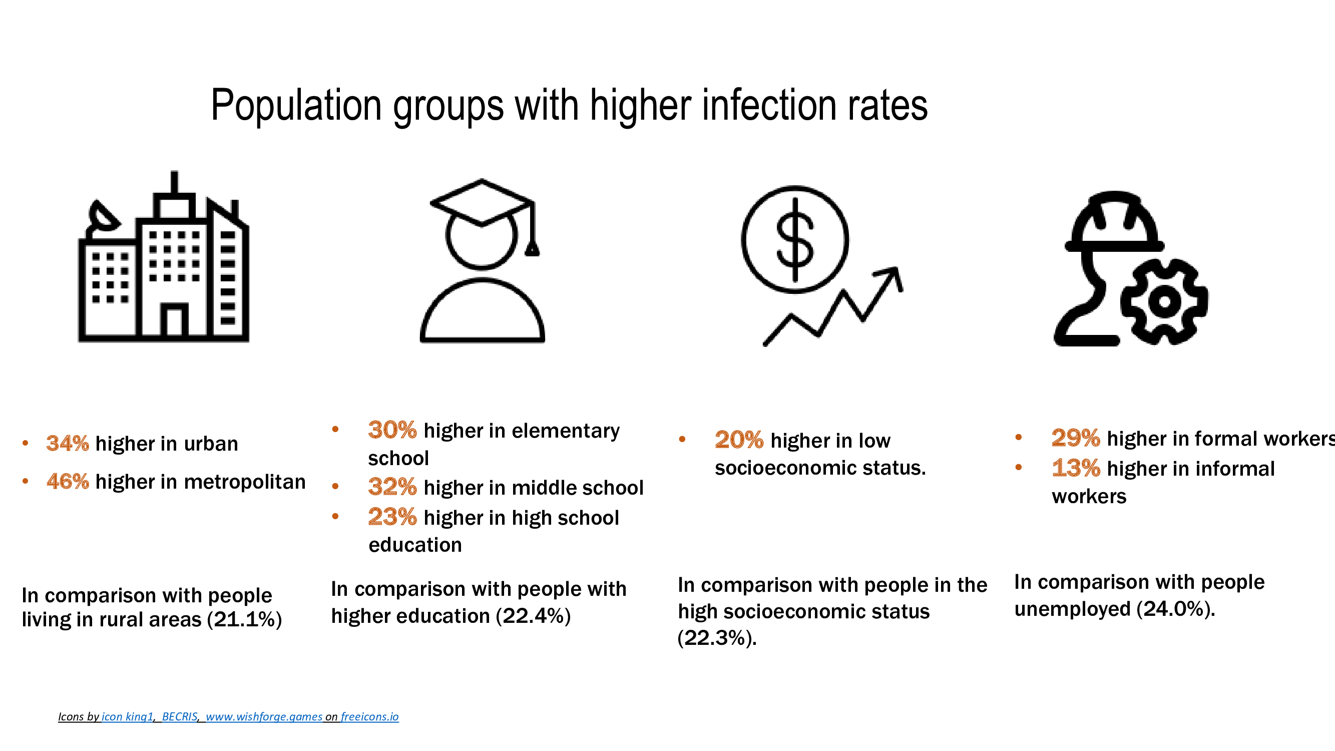 Another question that is often asked is if the COVID-19 infection affected everyone the same. The answer in our study is no. We found that some groups in the population experienced higher rates of infection, particularly:
