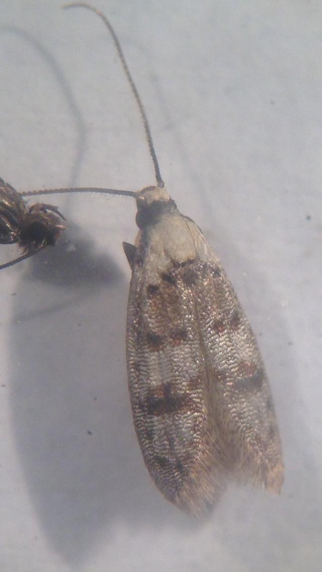 However, most of the moths we found were tiny and barely noticeable. They may seem dull in comparison until you put them under a microscope or learn about their behaviour. For example, Scatochresis innumera is a micro-moth (pictured below) that lays its eggs in possum poo. Its caterpillar spends its entire life feeding, and even pupating in a single scat. Another species in the Scatochresis genus specialises in koala poo, but unfortunately, this species, nor Koalas, could be found on the property.