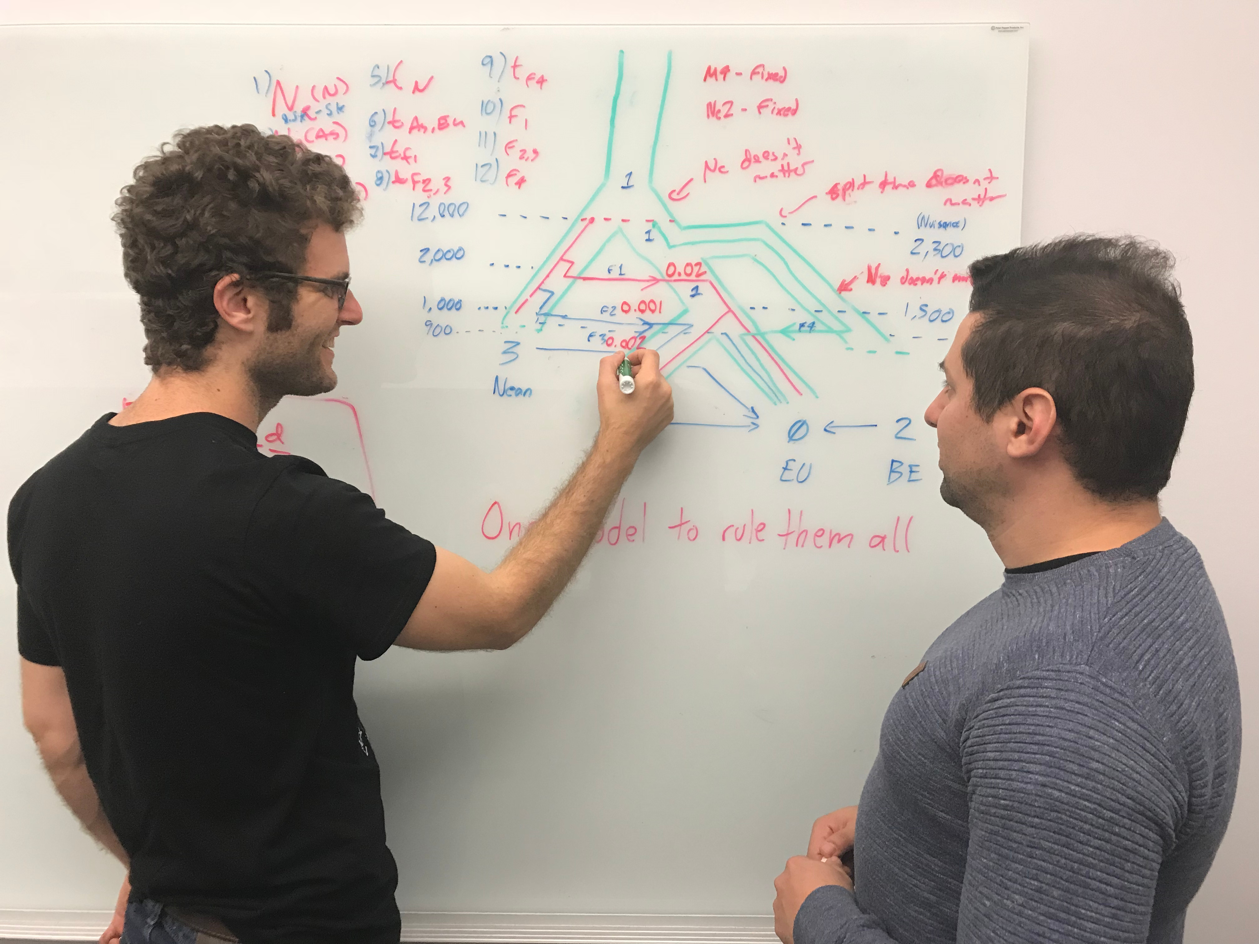 The idea of studying how the pattern of Neanderthal genome fragments is different between individuals from East Asia and Europe simmered in Josh Schraiber’s head since the time he was a postdoc with Joshua Akey. When it came time to address it, we decided on a two-pronged approach: we constructed both a mathematical and a computer model to explain how Neandertal DNA would be shared across human genomes under different numbers of human-Neandertal interbreeding events. We also explored an idea called European ‘dilution’. Under the dilution model, some non-African groups did not admix with Neandertals, and later those groups contributed to modern European ancestry, thereby ‘diluting’ European Neandertal ancestry.