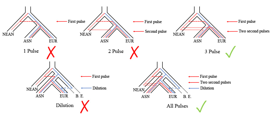 We looked both at Europeans and East Asians on their own – through a pen-and-paper mathematical model – and also in combination – through a simulation model –, and found strong support for modern humans interbreeding with Neandertals multiple times, first and foremost in the Middle East, but also later in both East Asia and Europe. The secondary admixture in East Asia was ever so slightly more extensive, resulting in the elevated contribution to the genomes of living East Asian individuals we see today. However, we cannot rule out dilution, and other lines of evidence suggesting that dilution played at least some role in shaping the distribution of Neandertal ancestry in present-day non-Africans.