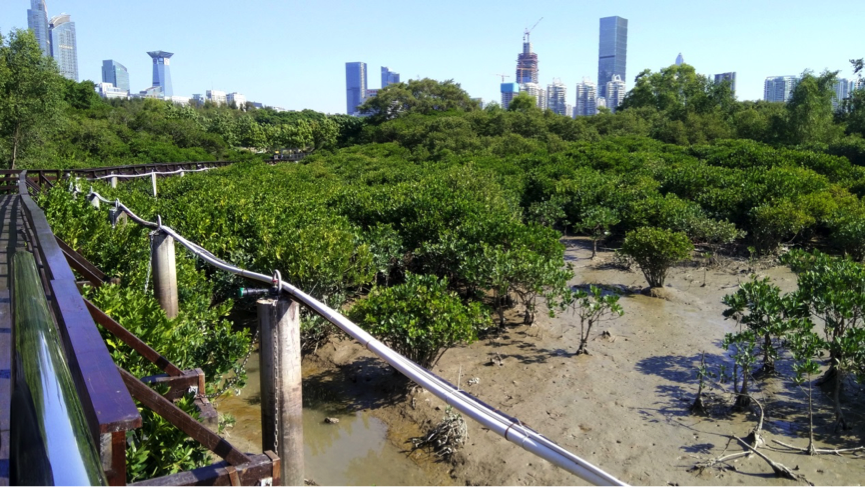 Mangroves are important constituents of the coastal wetlands. They could store atmospheric CO2 as organic matter, so-called “blue carbon”, inhabiting approximately 0.5% of the coast and contributing 10–15% to the global carbon storage. However, mangrove sediment carbon does not remain stored in perpetuity. Some of organic matter are transformed to CH4 and returned to the atmosphere, which has the potential to partially offset blue carbon storage in mangrove sediments. Most pristine mangroves showed low CH4 efflux rate, while mangroves with human disturbances showed significantly higher CH4 efflux rate. Futian Mangrove Nature Reserve (FT) is located in the urban hinterland of Shenzhen Special Economic Zone, China (Figure 1). FT is a restricted area since establish of Futian Natural Reserve in 1980s. It is dominated by native, true mangrove flora and is one of the largest mangrove habitats along the southeastern coast of mainland China. It has been reported that methane emission rates in FT range from 242 μmol m−2 day−1 to 124 mmol m−2 day−1.