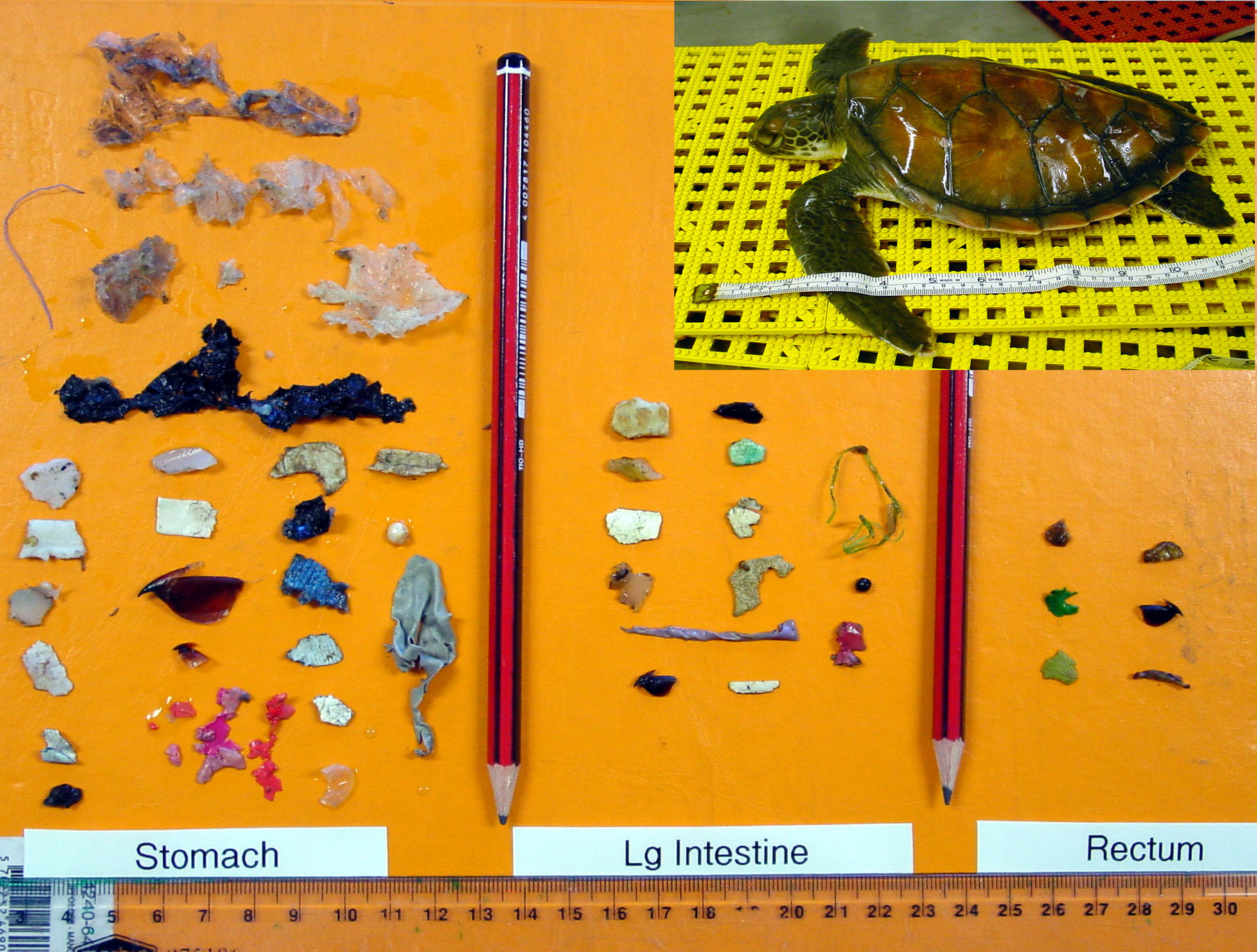 We assigned the turtles to categories: those turtles that had plastic in them but definitely died from something else (like being hit by a boat or tangled in a net); animals that had eaten plastic but we don’t know how they died (which was most of the turtles); and those animals that we were certain died from eating plastic.