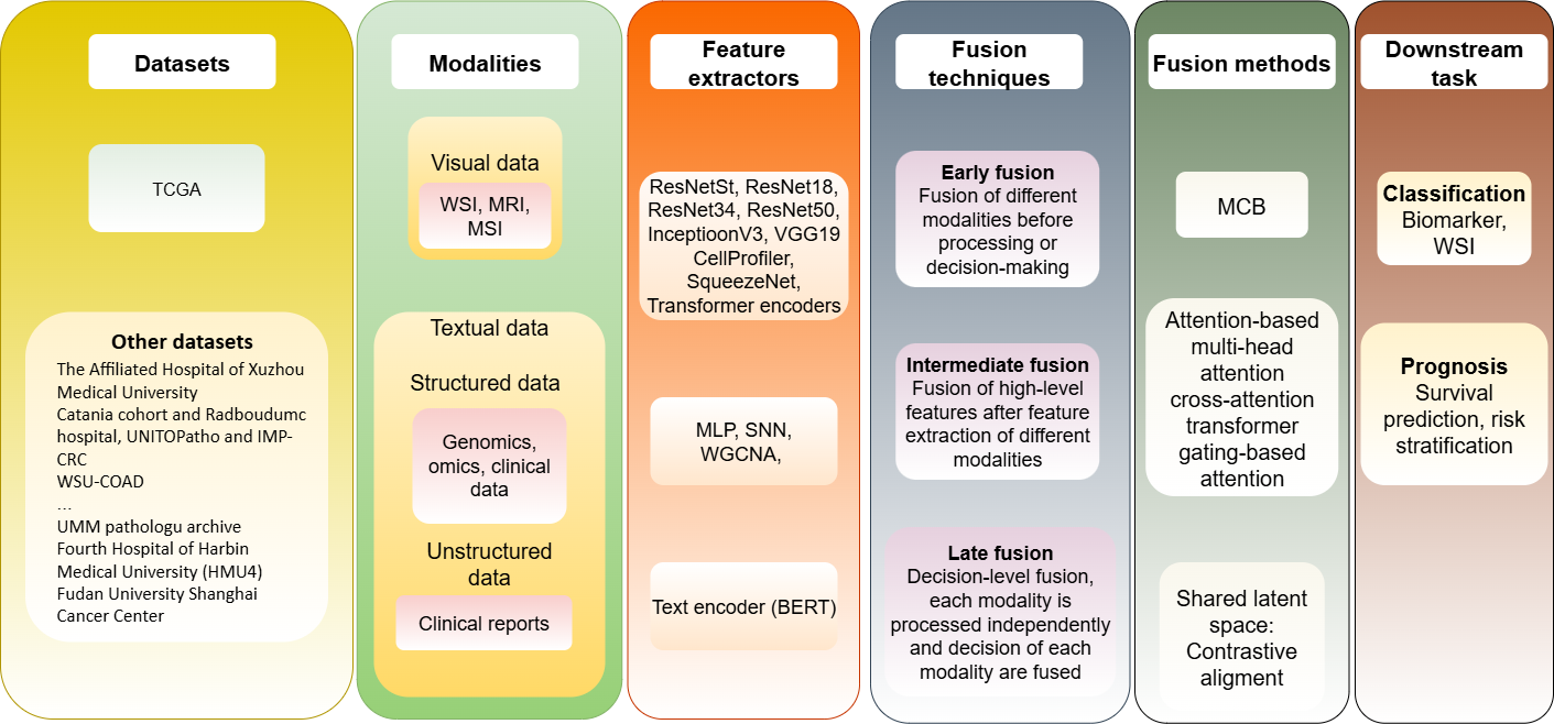 We hope our work informs both researchers and clinicians working on CRC by highlighting the research gaps, latest advances and future research directions. As part of our current research, we are experimenting with a novel contrastive-learning-based architecture on the MCO dataset and hypothesise that multimodal models can outperform single-modality approaches even with limited data. A key priority is the development of multicohort studies to improve robustness and generalisability, given the field’s current dependence on single-centre datasets. There is also major potential for adopting and adapting foundation models capable of learning richer cross-modal representations.