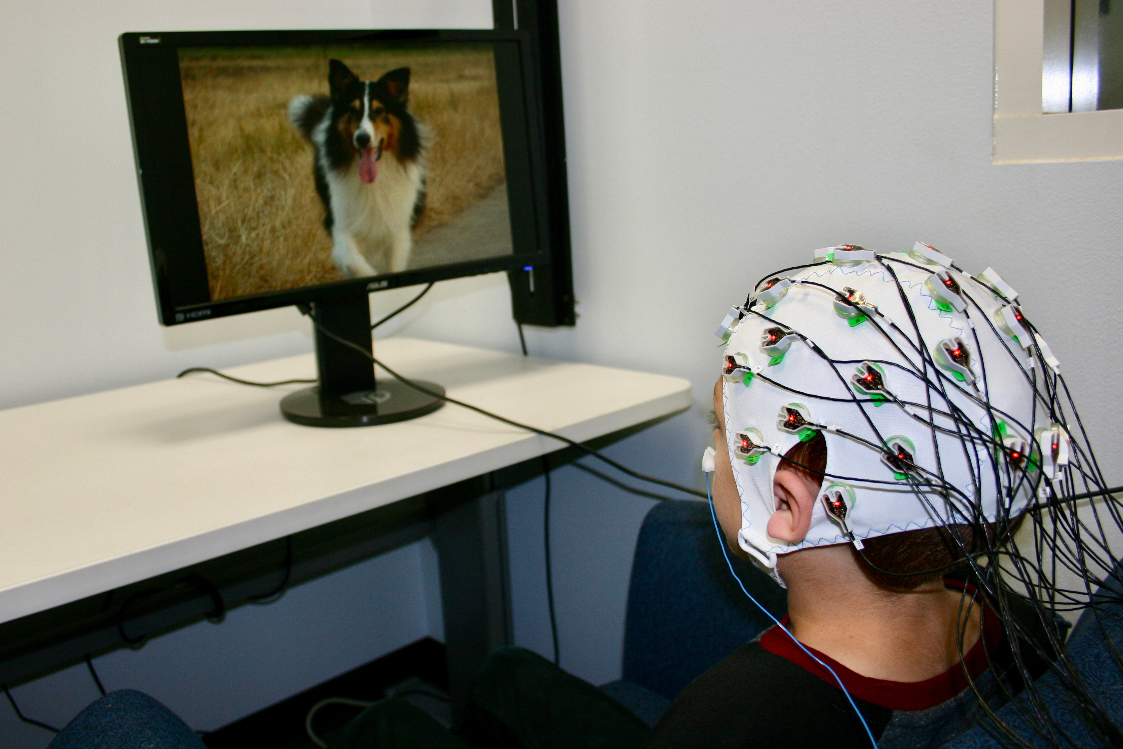 Photo: In this photo one of our participants is watching pictures while wearing the cap. A computer in a different room is recording brain activity while the child watches pictures. Photo © Ainsley Losh