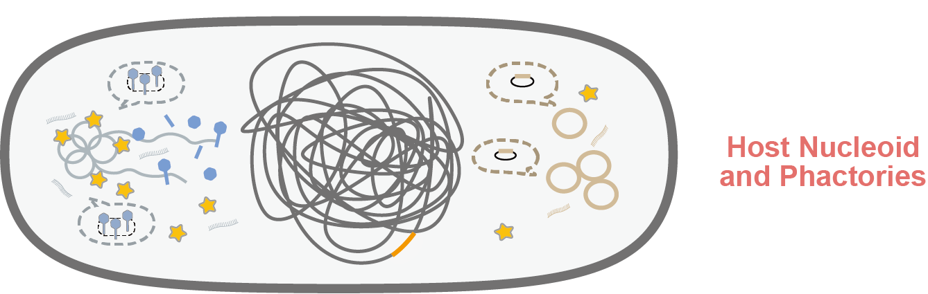 No, not outer space, but rather the physical space inside a bacterial cell, is where the phage develops. By labeling phage DNAs and a resource needed for phage DNA replication, we found that a single phage DNA will gather resources to its own location. Lambda will then replicate its DNA, keeping its direct DNA descendants nearby itself and its resources, and create new viral particles inside its personal space, so to speak. Basically, the individual phage built its own subcellular phage factory, shortened to “phactory”. Consequently, when multiple phages infect the same cell, they can form separate phactories and maintain responsible social distancing. It turns out that the existing structure of the cell, the bacterial nucleoid, can effectively serve as a fence between neighboring phages, defining their borders. Additionally, the mRNA transcripts produced from phage DNA are localized as part of each phactory, which is another important layer to phage individuality. This is because different phactories in one cell can have different transcription profiles, meaning that separate phages can undergo divergent gene expression in one cell. This begins to explain the subcellular voting behaviors we observed previously.