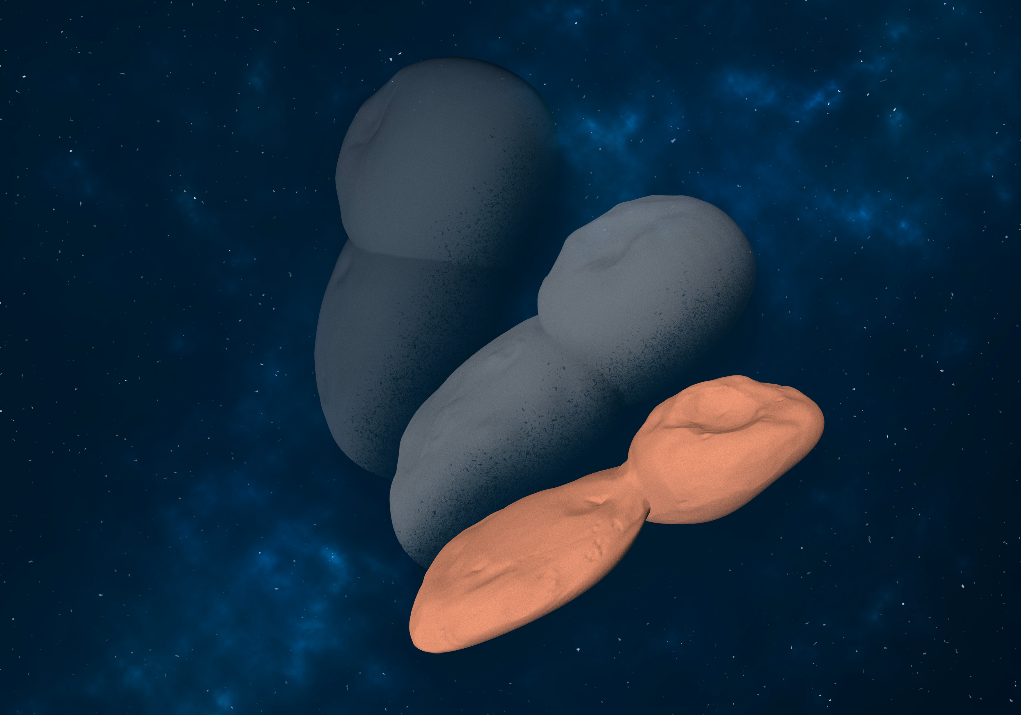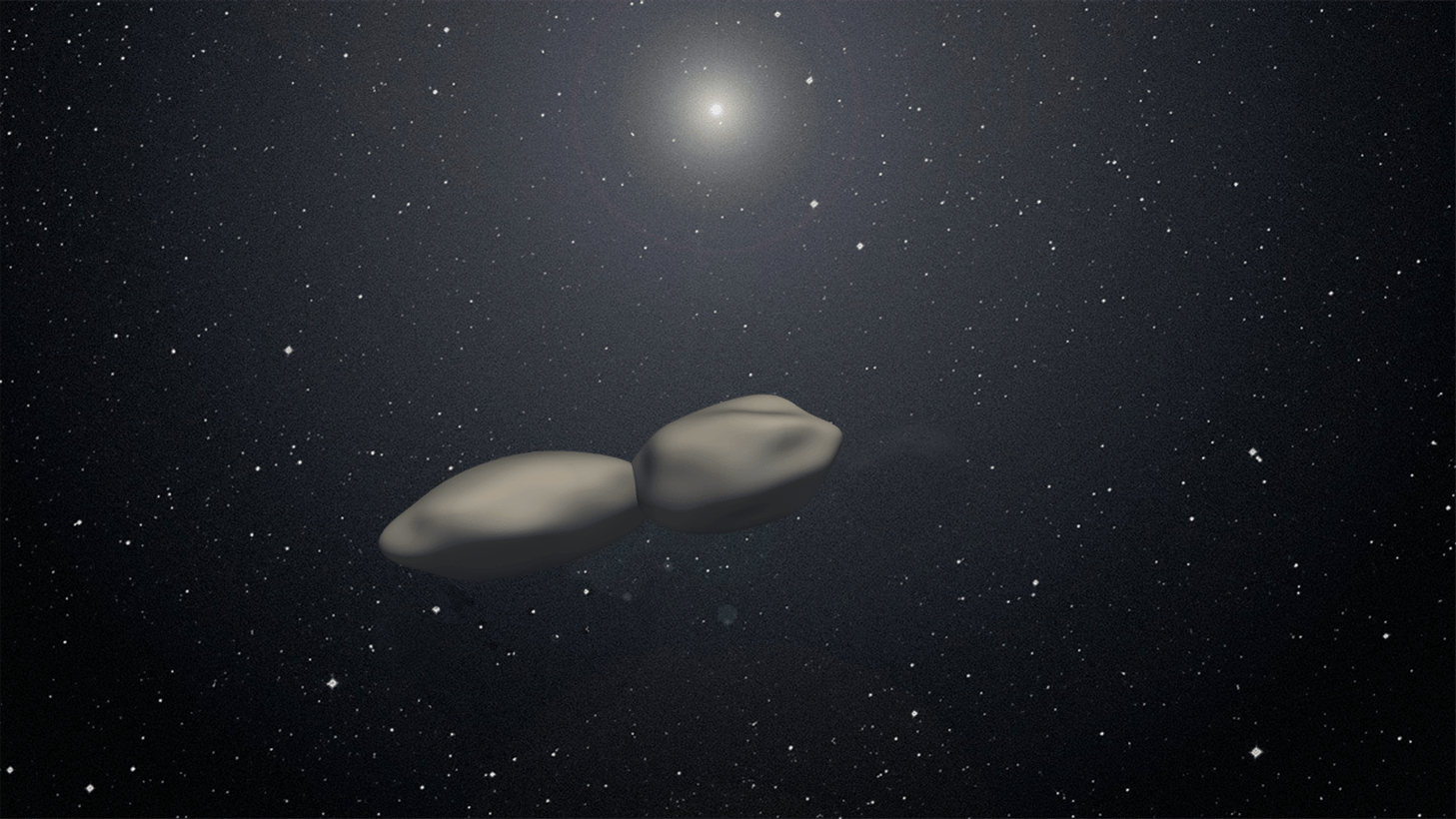 Fig. 3 The bilobed and flattened shape of (486958) Arrokoth determined by the New Horizons observation data. Credit: PMO/X. Zheng/Y. Zhao;shape model: NASA/Spencer et al., Science, (2020); background: Courtesy of Southwest Research Institute and Alex H. Parker