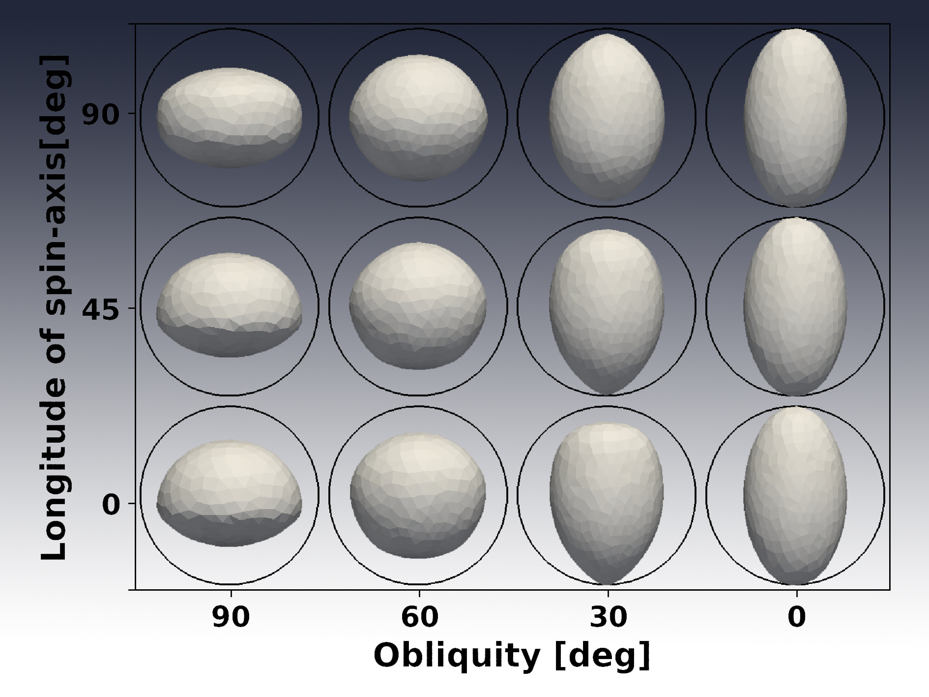 Fig. 2 The resultant shape changes from an initially spherical object for different configurations of spin axis obliquity (θ) and longitude of spin-axis (ϕ). The circles mark the size of the original (spherical) body. The semi-major axis and eccentricity of orbit are 200 au and 0.3, respectively. Credit: Zhao et al., MNRAS, (2020)